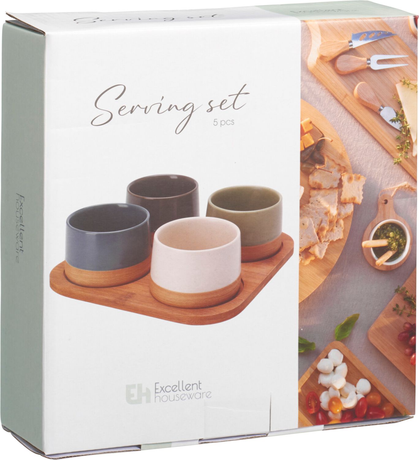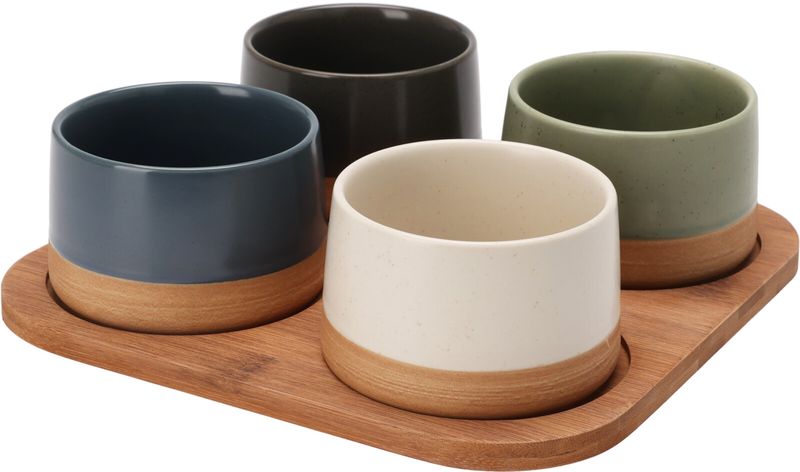Ein Set bestehend aus einem Serviertablett aus Bambusholz und Vier Schalen aus Ton in den Farben Cremeweiß, Grün, Graublau und Grüngrau
