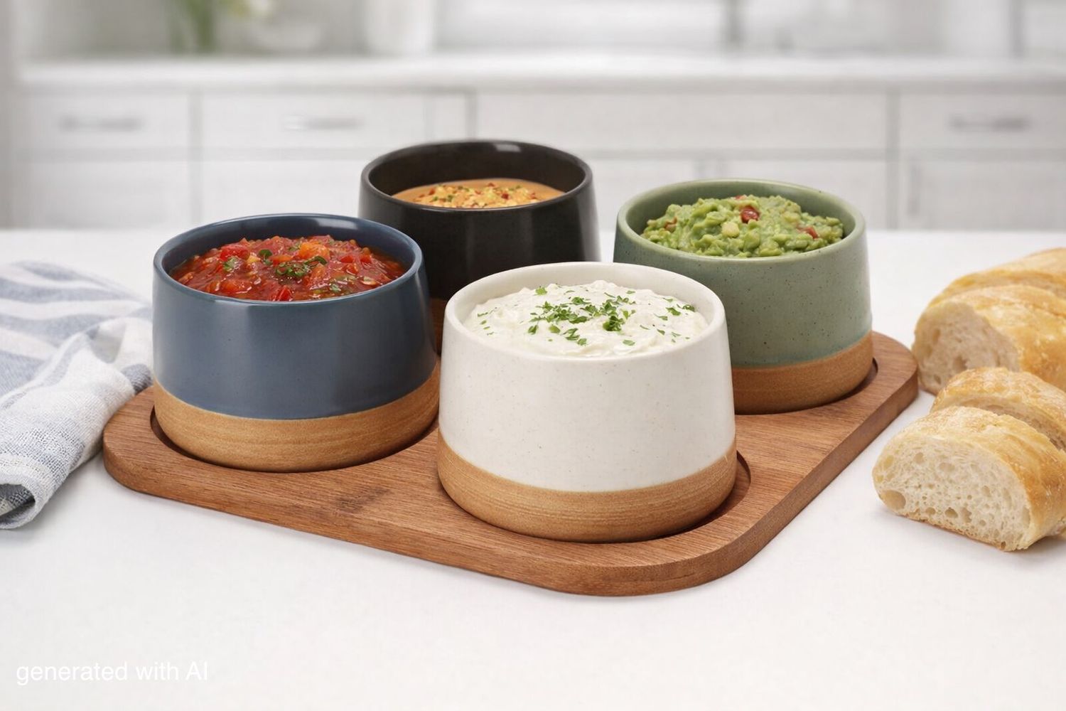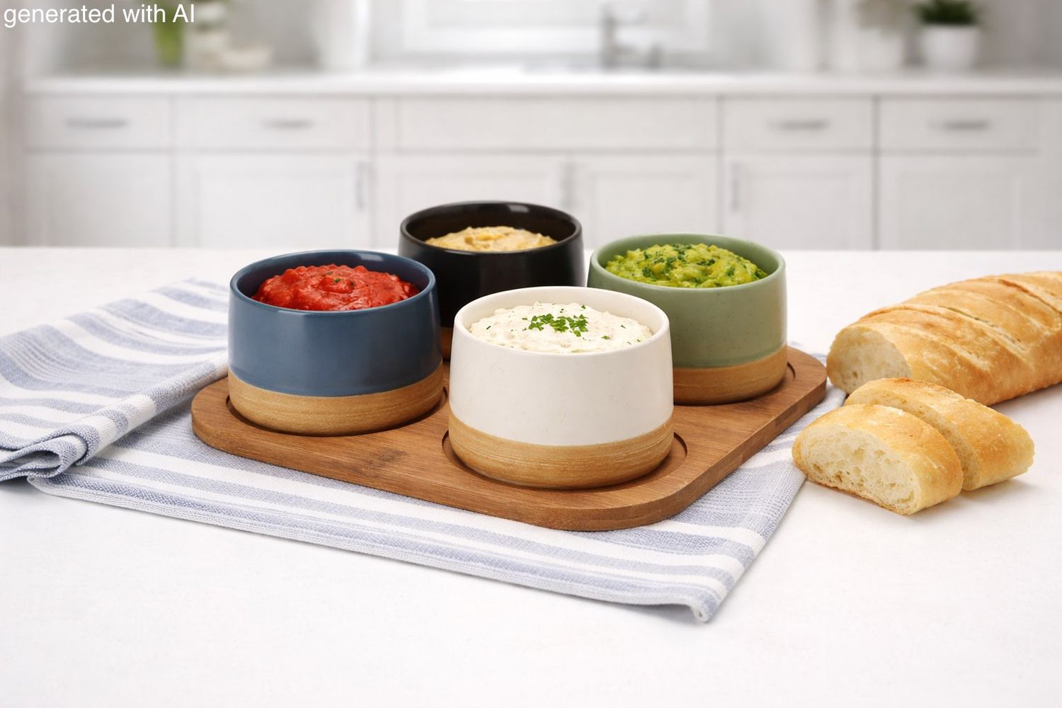 Serviertablett aus Bambusholz mit vier Schalen für Snacks, Dips, Oliven, Desserts, Vorspeisen oder Tapas