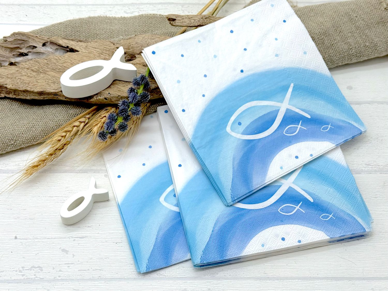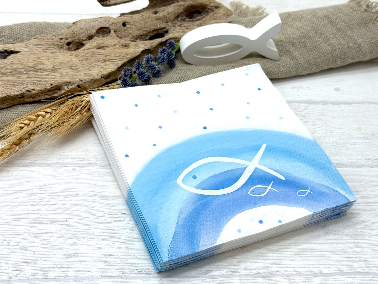 Diese dezenten, mit dem christlichen Symbol Fisch und einem Regenbogen bedruckten Servietten in Hellblau und Weiß, verleihen Ihrer Tischdeko zur Kommunion und Taufe ein stilvolles Flair.