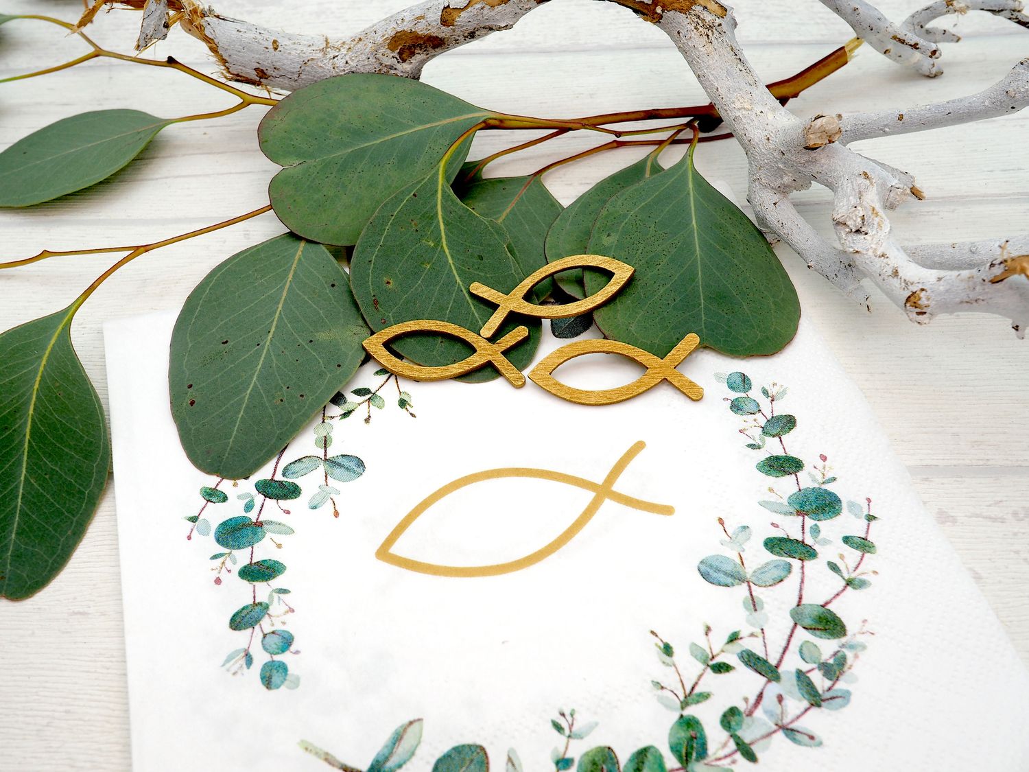 Servietten mit dem christlichen Symbol Fisch in Gold in einem Blätterkranz mit Eukalyptus verleihen deinem festlich gestalteten Tisch oder deinem Buffet das gewünschte frische und festliche Ambiente.