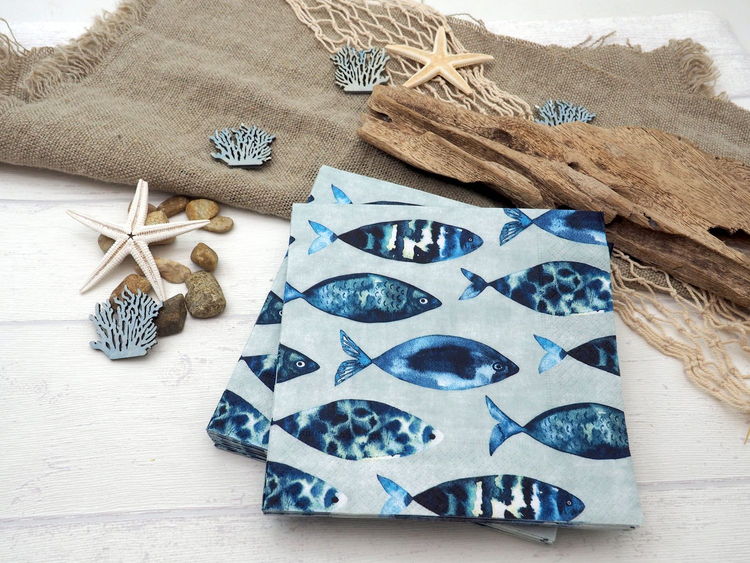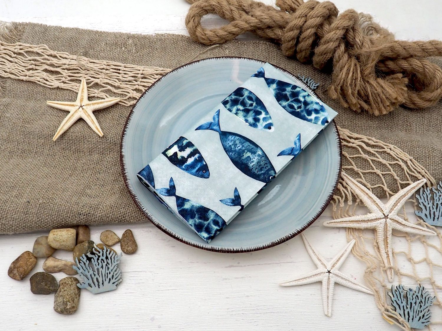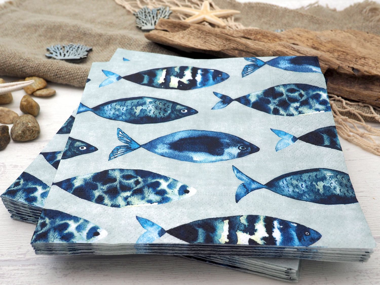 20 maritime Servietten mit Fischmotiven in Blau auf Hellgrün für eine leichte, sommerliche und stilvolle Tischdekoration
