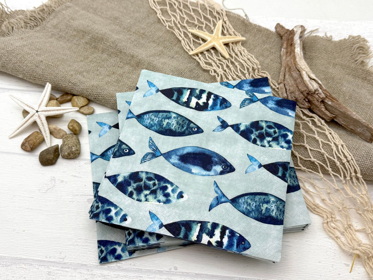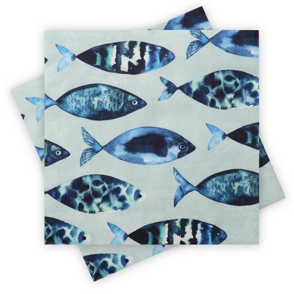 20 Stück Servietten in Hellgrün mit verschiedener Fischmotive in Blautönen in einem stilisierten Druckstil