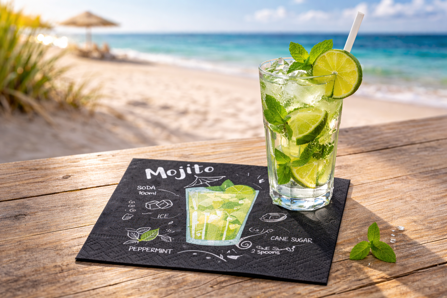 Jede Serviette ist kunstvoll mit einem detailreichen Mojito-Motiv bedruckt, das die klassischen Zutaten wie Limette, Minze und Eiswürfel zeigt und sofort Lust auf einen erfrischenden Cocktail weckt.