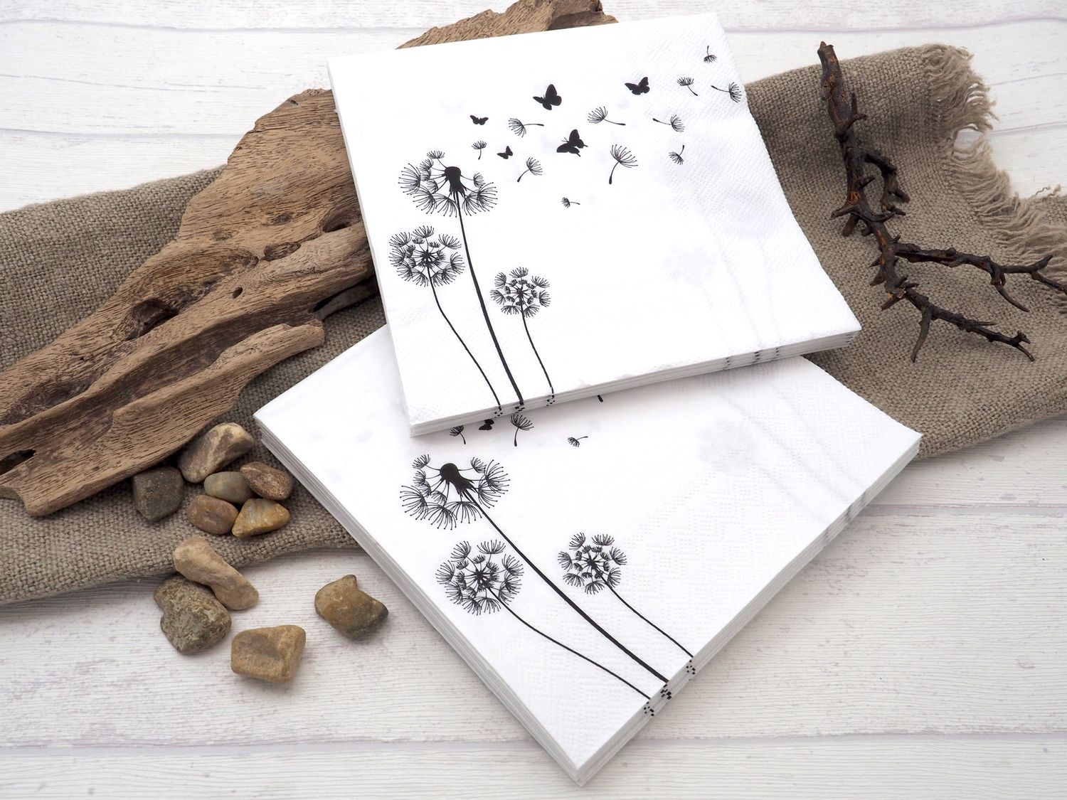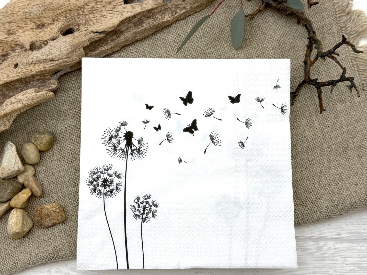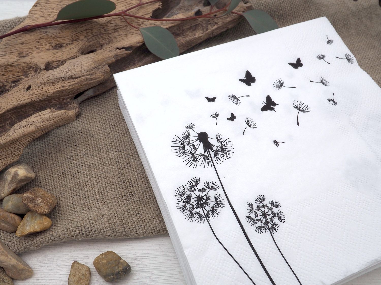 20 Stück Servietten in Weiß mit Pusteblumen in Schwarz