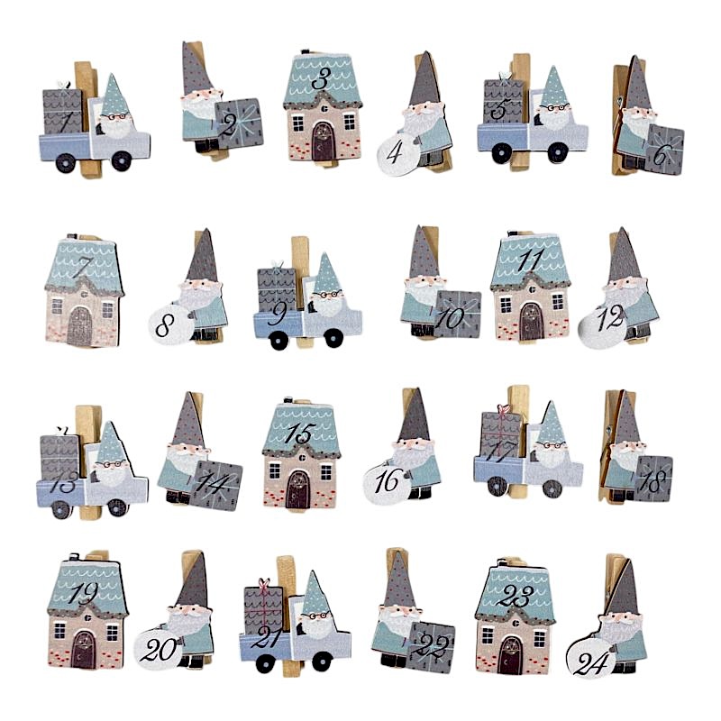 Ein Set bestehend aus 24 Holzklammern mit Holzmotiv „Wichtel“ - für DIY Adventskalender, Weihnachtskalender oder Adventskalender mit Wichtel Zubehör