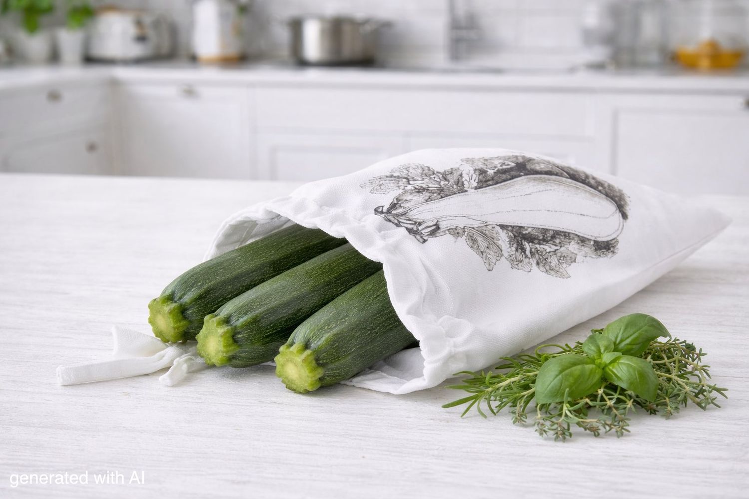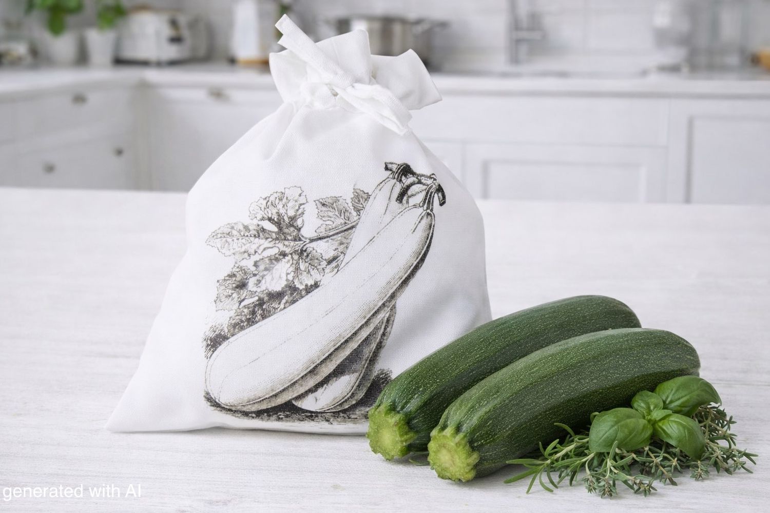 Stoffbeutel - Aufbewahrungsbeutel mit Zugband und Gemüse-Zucchini Bild
