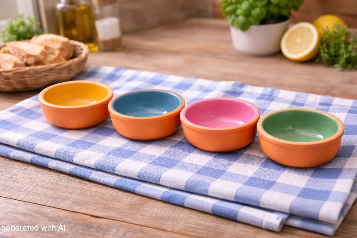 Set aus vier bunte Tapas - Schalen aus Ton mit glasierter Innenseite