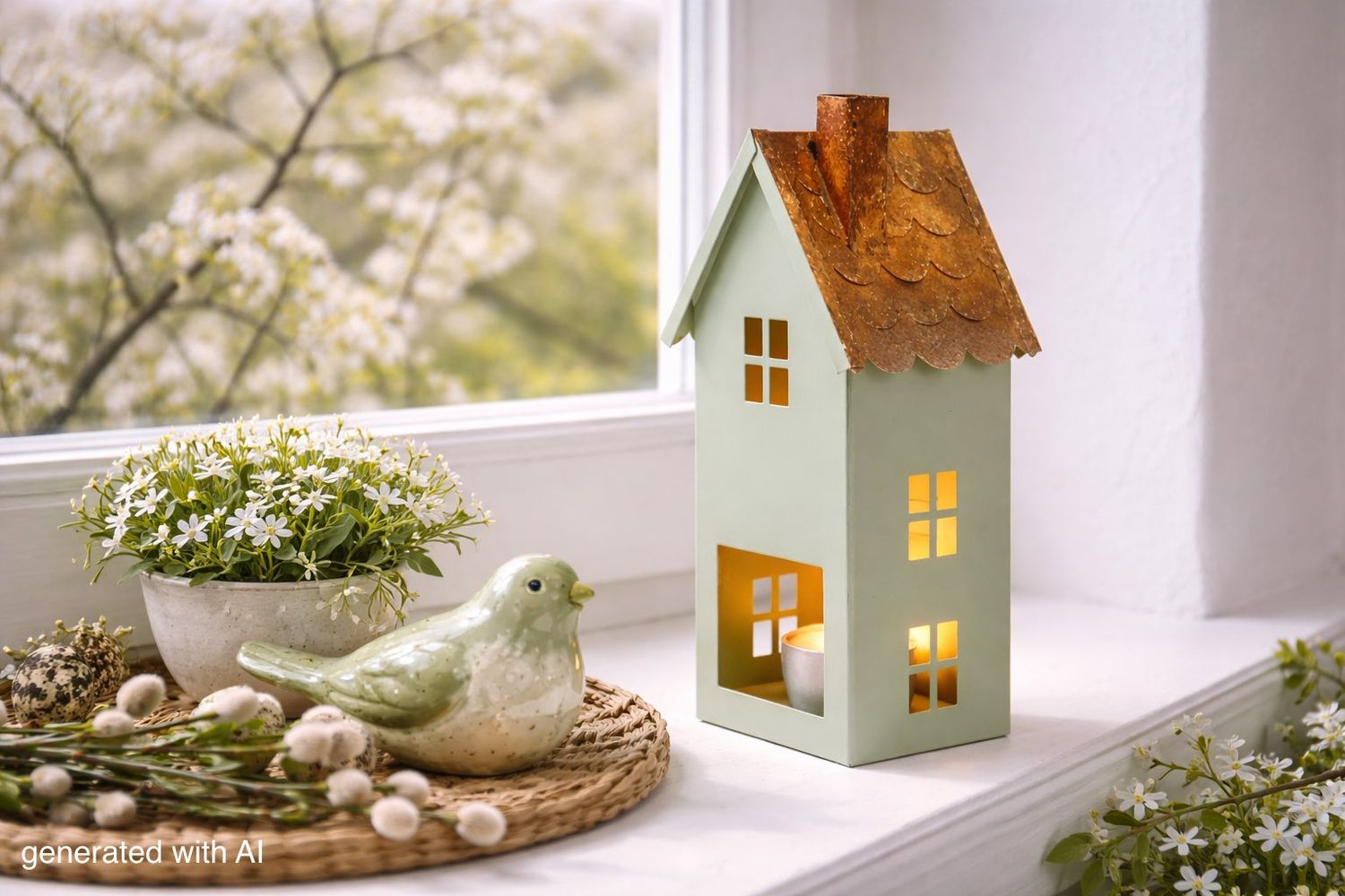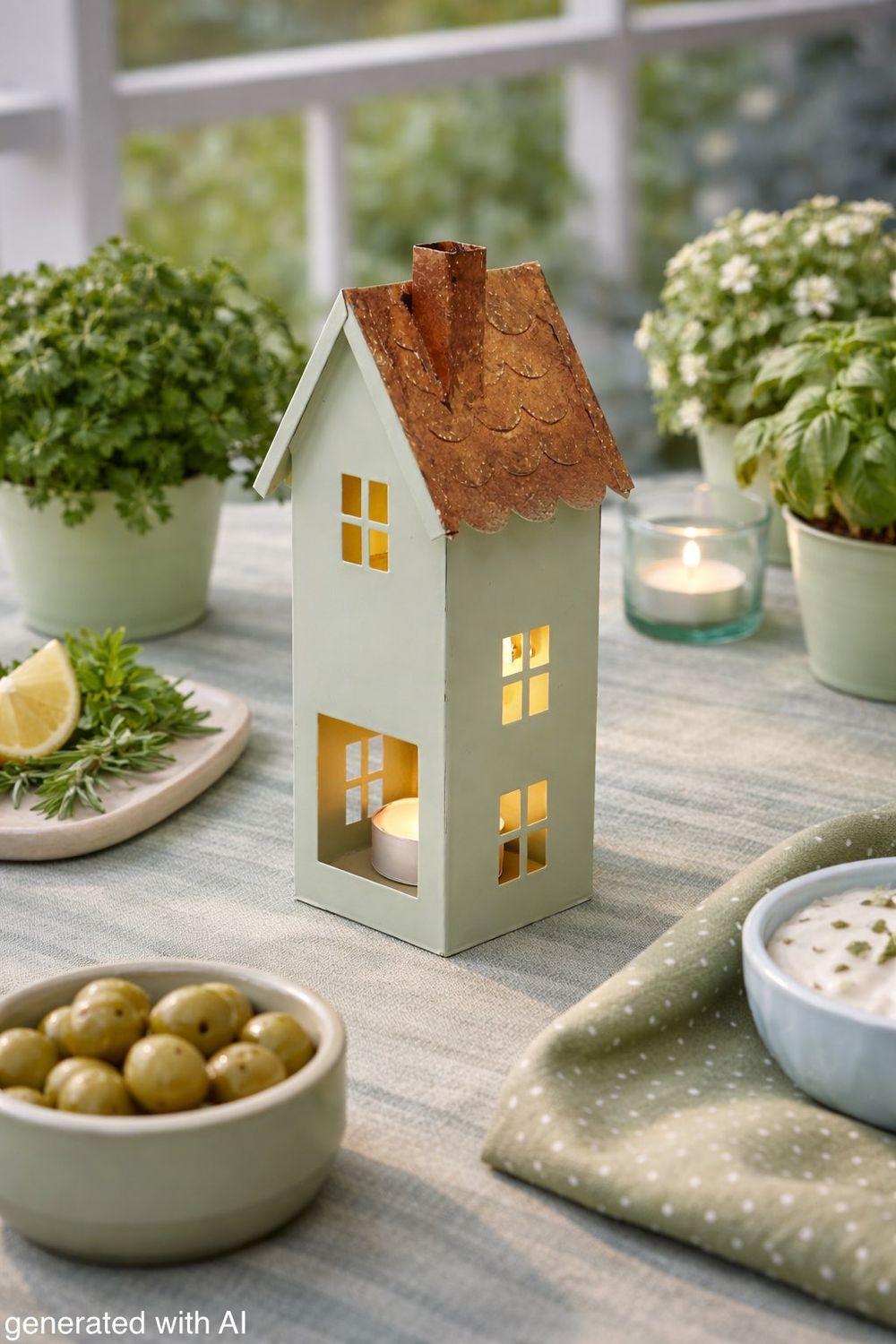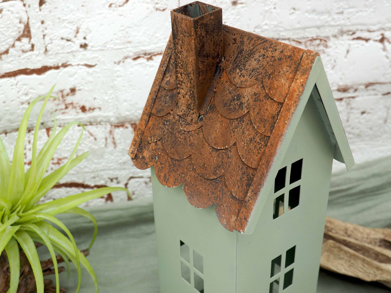 Dekoratives Teelichthaus aus Metall in Salbeigrün mit einem Rostdach, Fenstern und Schornstein