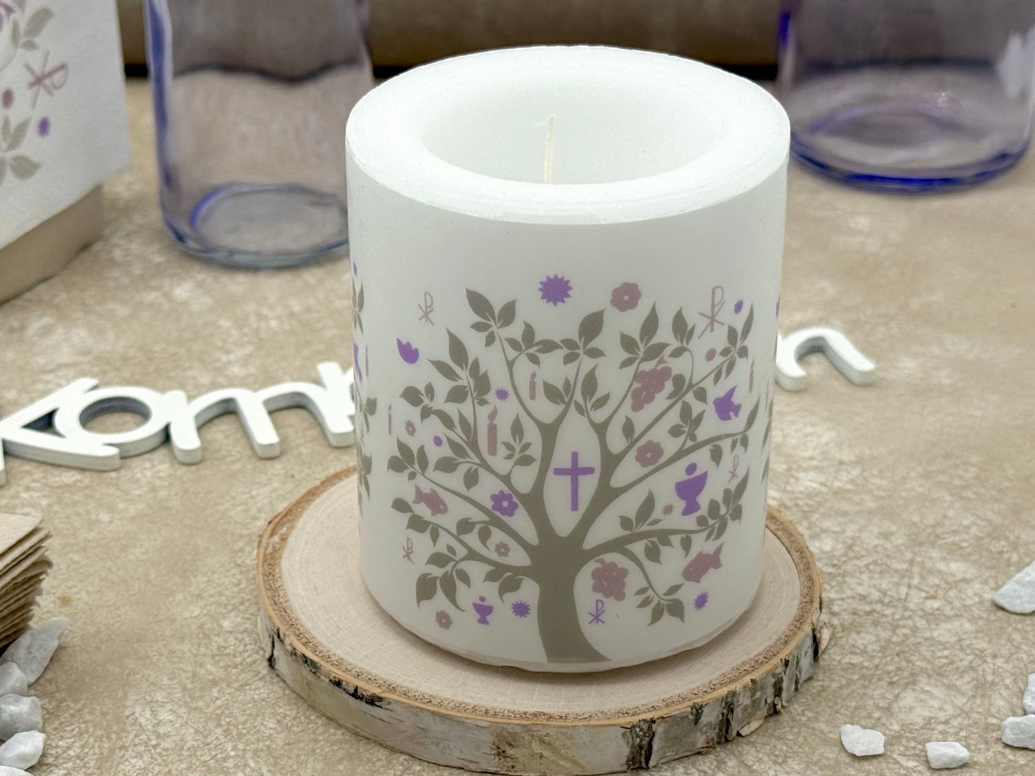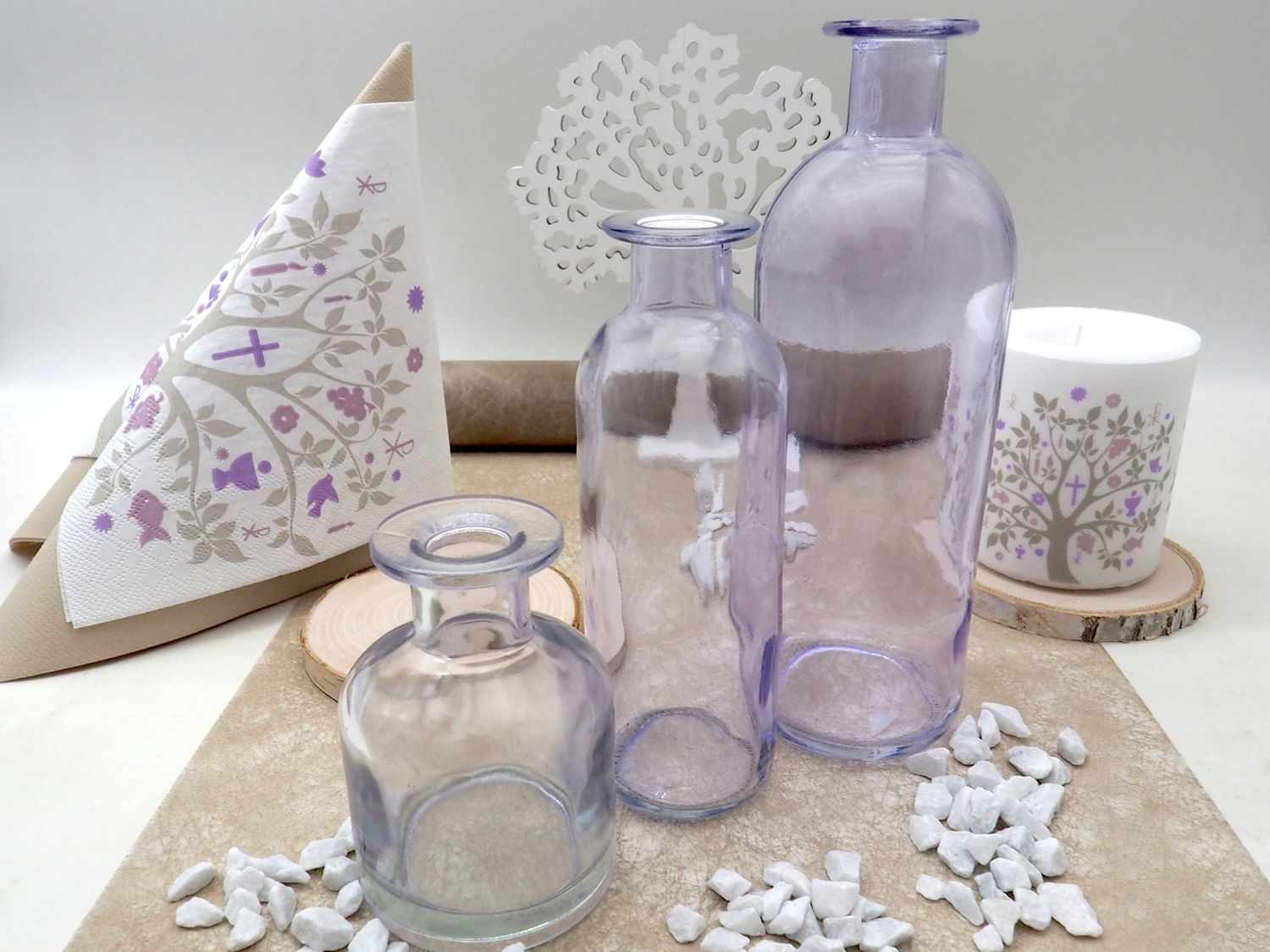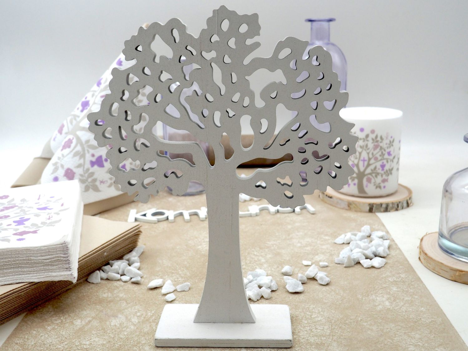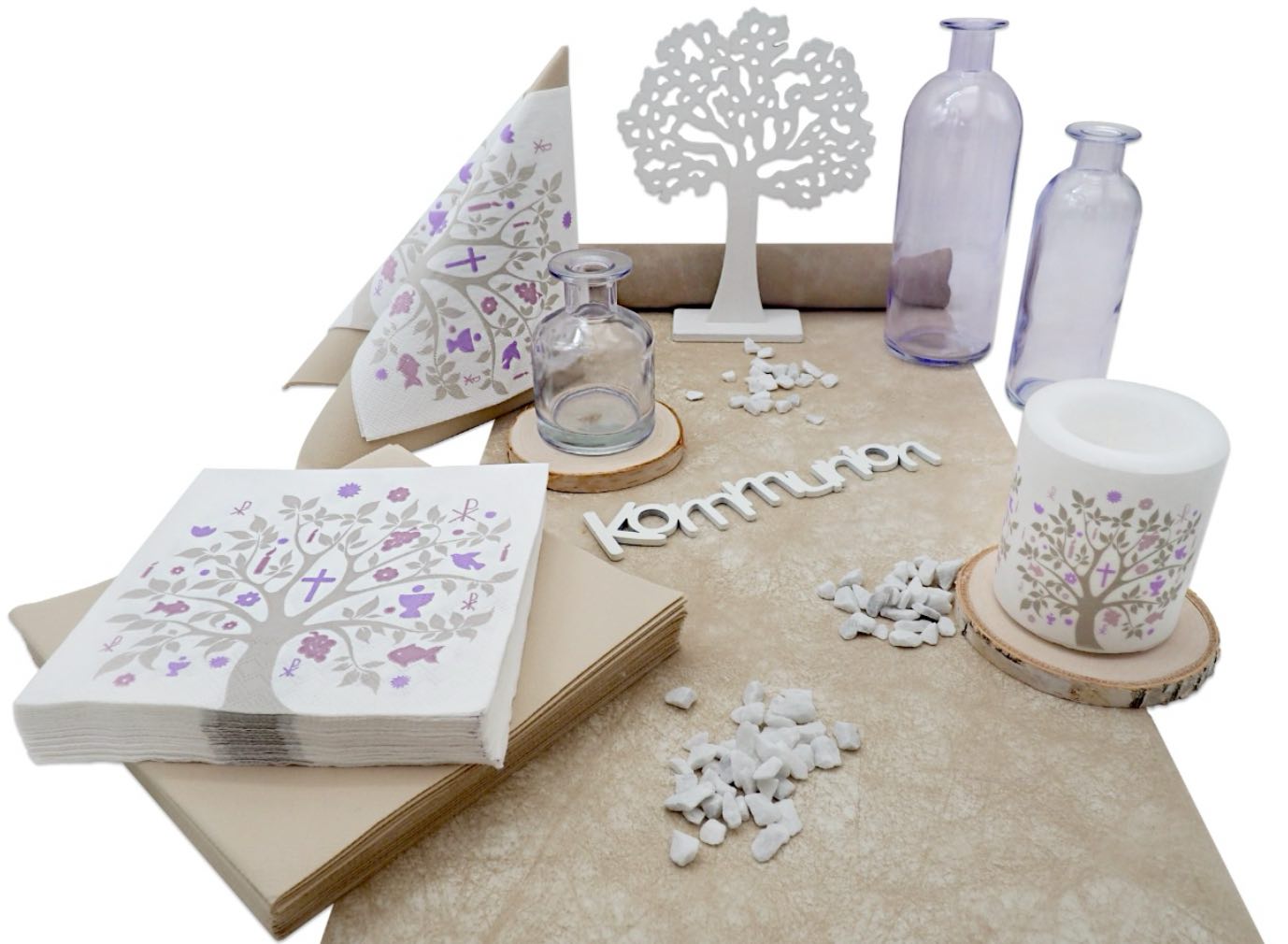 Komplettes Tischdeko Set für 20 Personen „Baum des Lebens“ in Beige & Flieder – Kommunion Konfirmation Deko