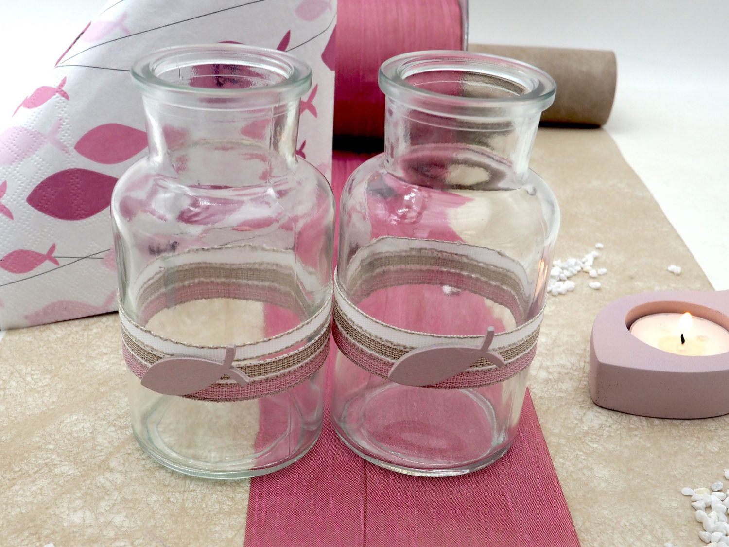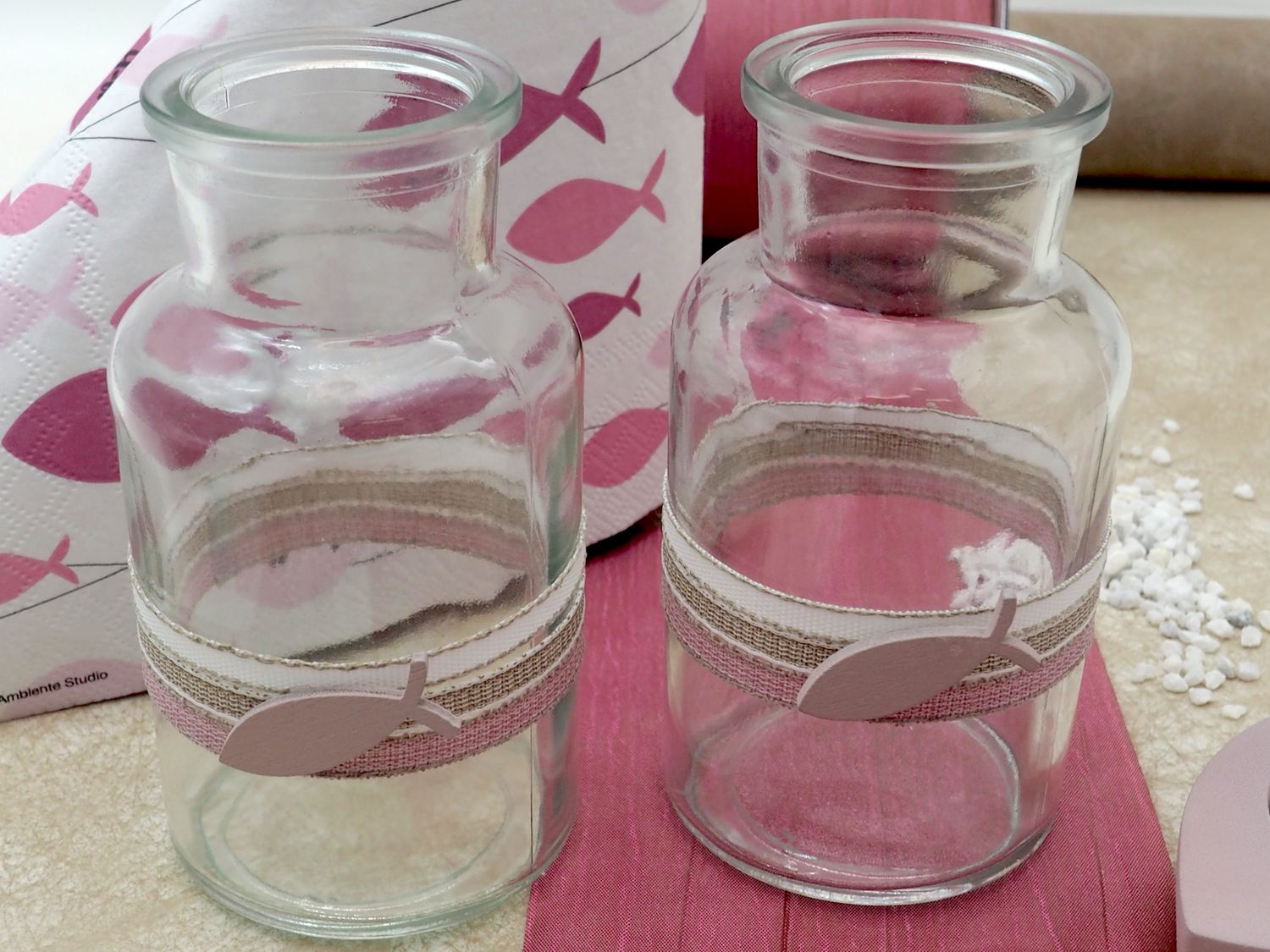Dekoriert mit Leinenbändern und HolzfischÂ