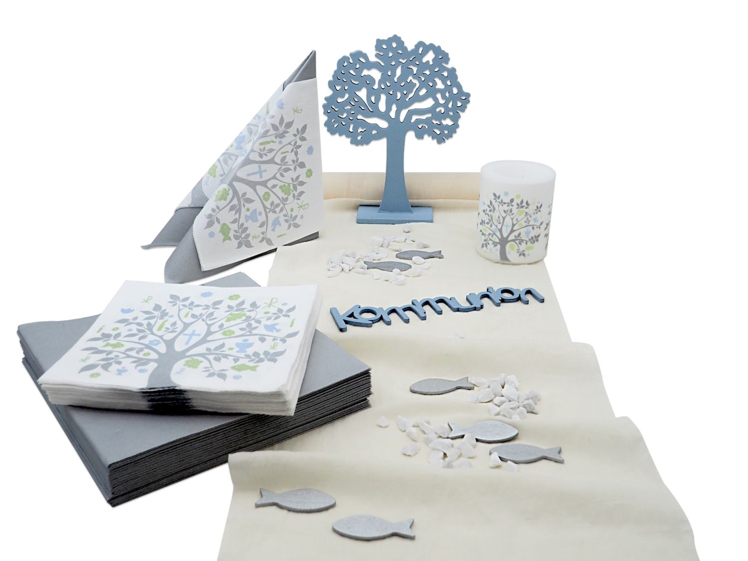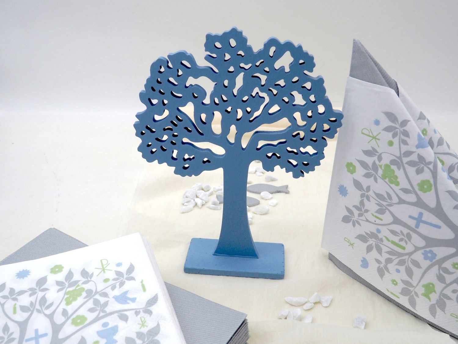 Deko Set mit Motiv Baum des Lebens in Blau – abgestimmte Tischdekoration für religiöse Feiern