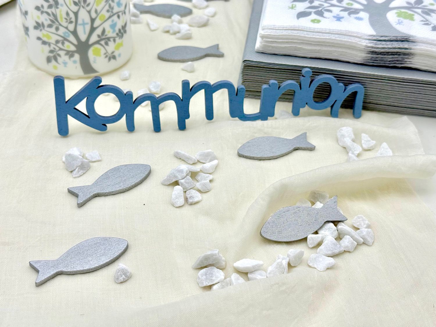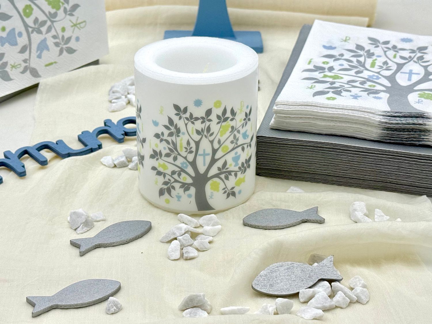 Die Kombination aus Blau, Silber und Creme, natürlichen Materialien und religiöser Symbolik macht das Set zur perfekten Wahl für Kommunion, Konfirmation, Taufe oder Firmung.