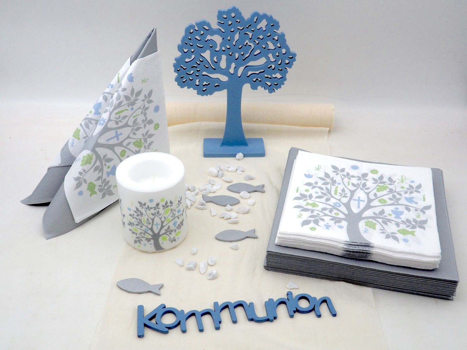 Neben Servietten, Stoff-Tischband, Schriftzug und Holzfigur Lebensbaum enthält das Set, eine Motivkerze sowie Streudeko – ideal für eine sofort fertige Tischgestaltung ohne zusätzlichen Aufwand.