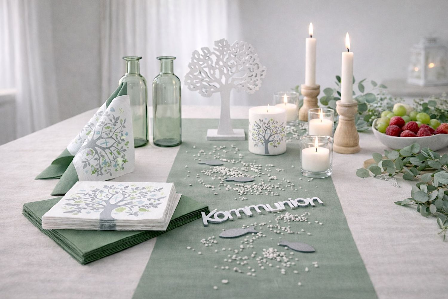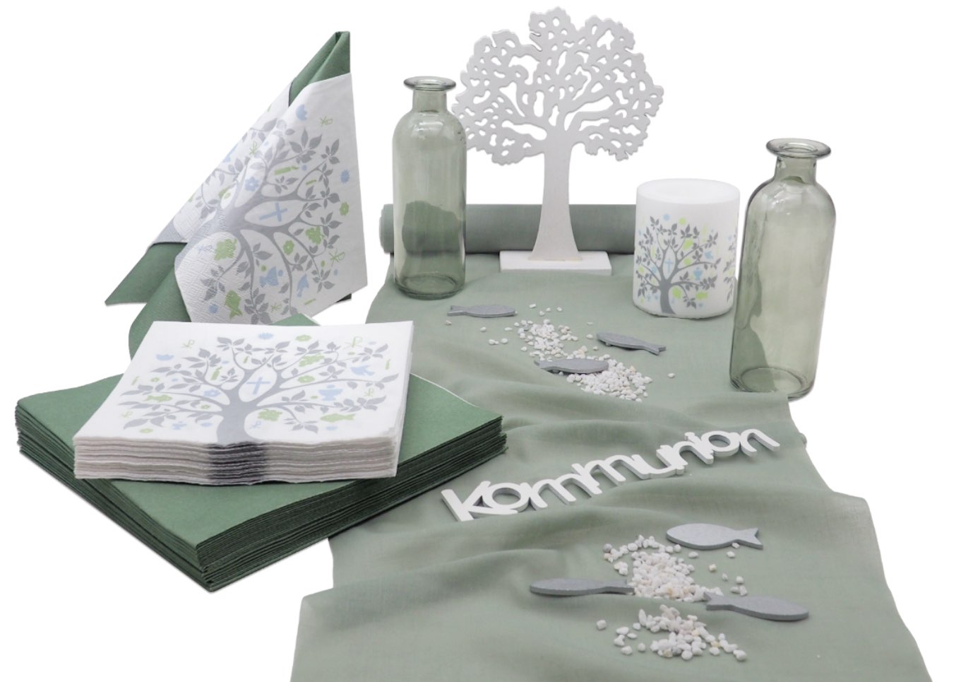 Deko Set mit Motiv Baum des Lebens in Salbei Grün – abgestimmte Tischdekoration für religiöse Feiern