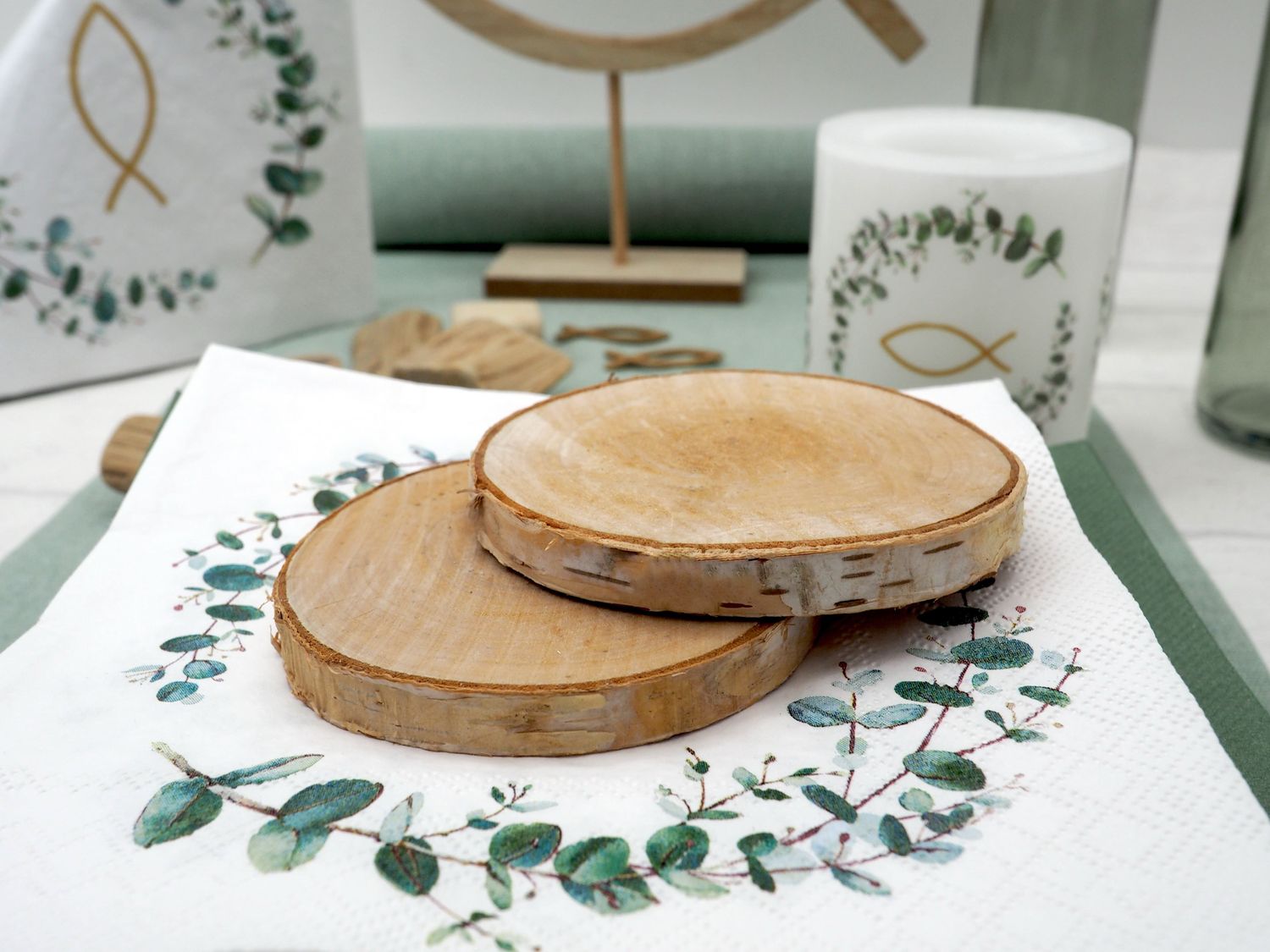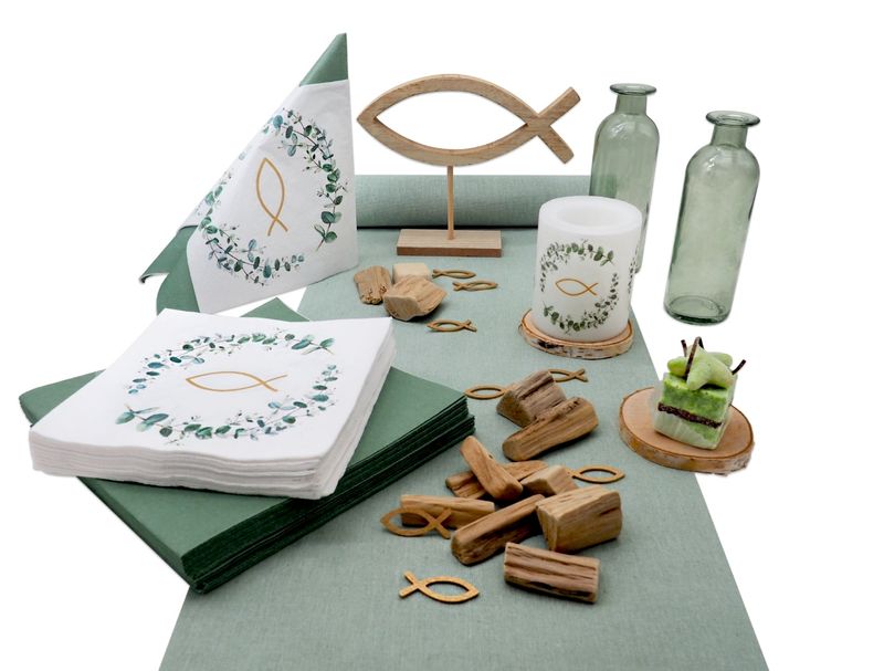 Tischdeko Set Kommunion Konfirmation in Salbei Grün und Fisch im Eukalyptuskreis – Servietten, Kerze, Streudeko & Vase