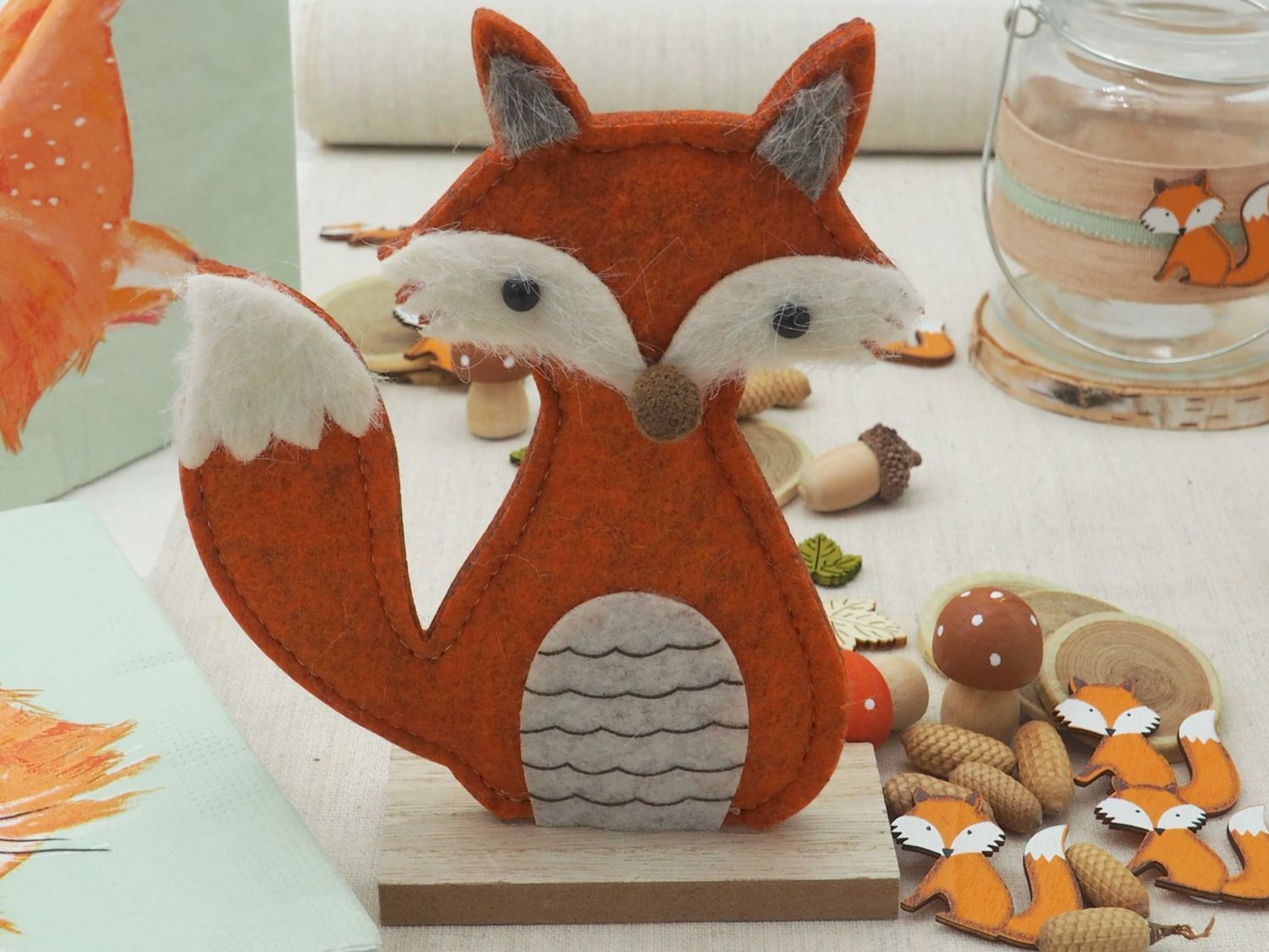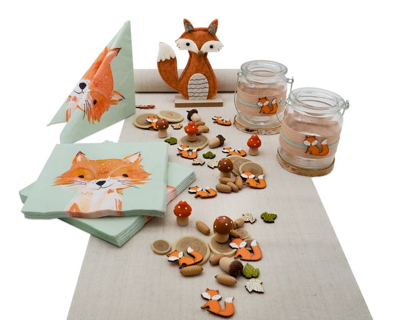 Tischdeko Set Kindergeburtstag Fuchs – Aufsteller Fuchs, Servietten, Tischband, Windlichter, Streudeko, kleine PilzeÂ