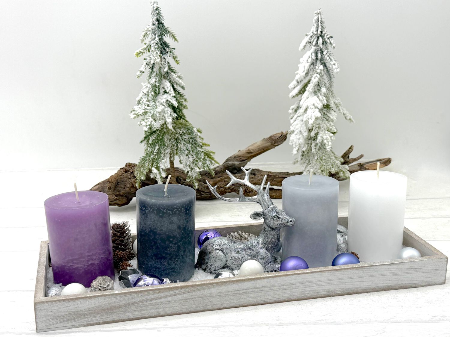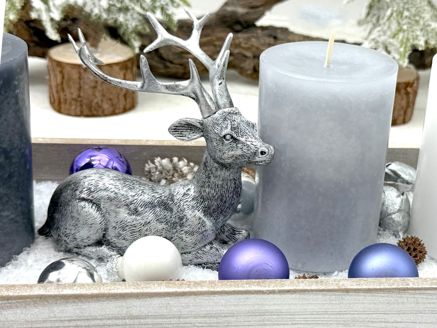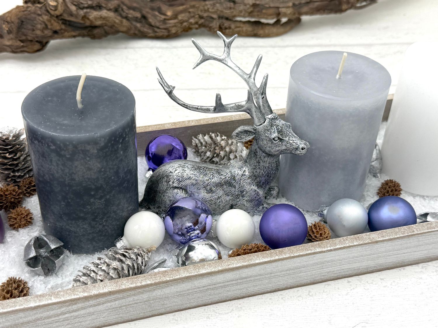 Ein längliches Tablett aus Holz in Grau mit vier Adventskerzen in vier Farben: Dunkel und Hell Grau, Weiß und Flieder, mit einem liegenden Hirsch in Silber und weihnachtlicher Streudeko