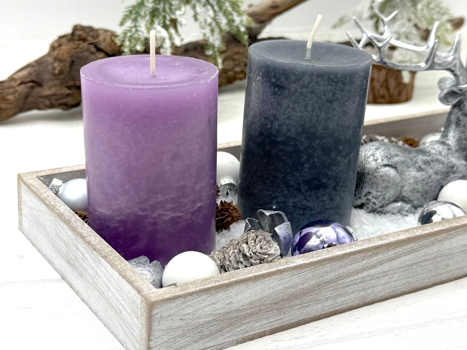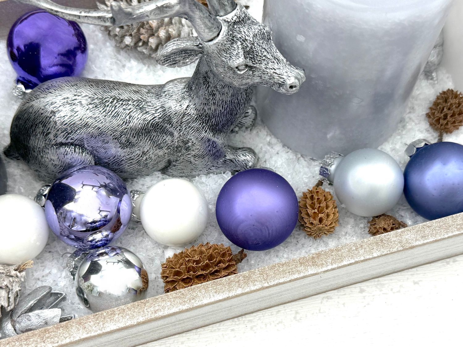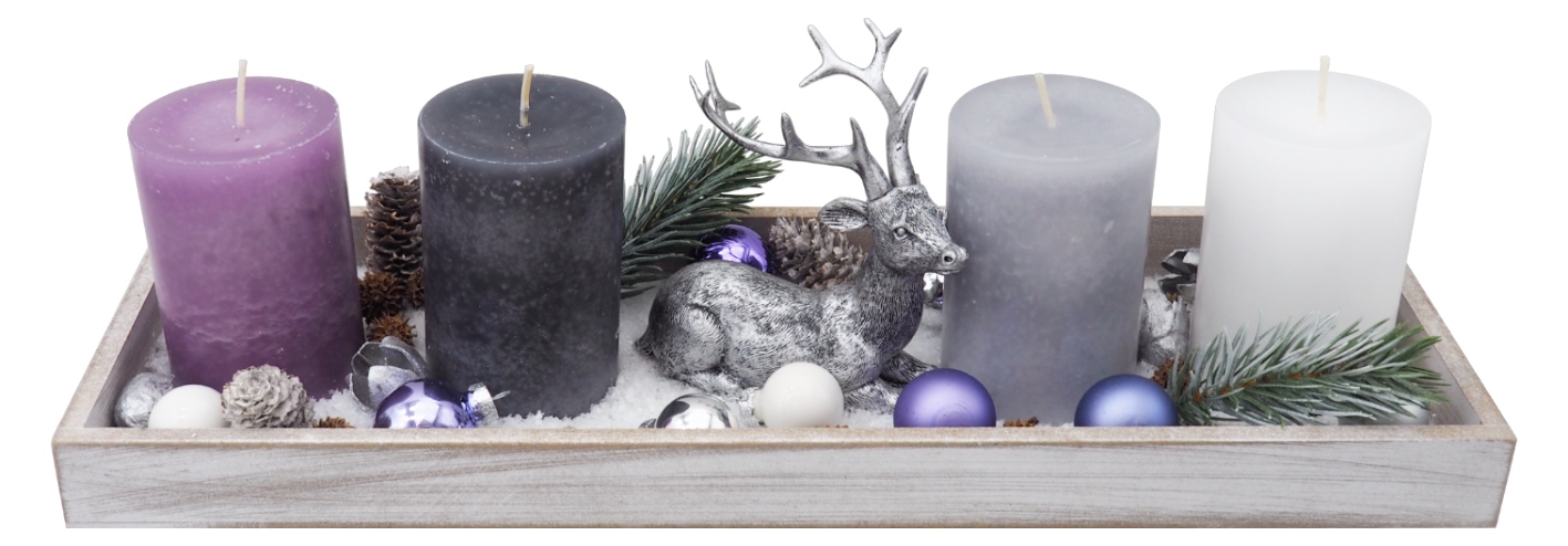 Ein längliches Tablett aus Holz in Grau mit vier Adventskerzen in vier Farben: Dunkel und Hell Grau, Weiß und Flieder, mit einem liegenden Hirsch in Silber und weihnachtlicher Streudeko