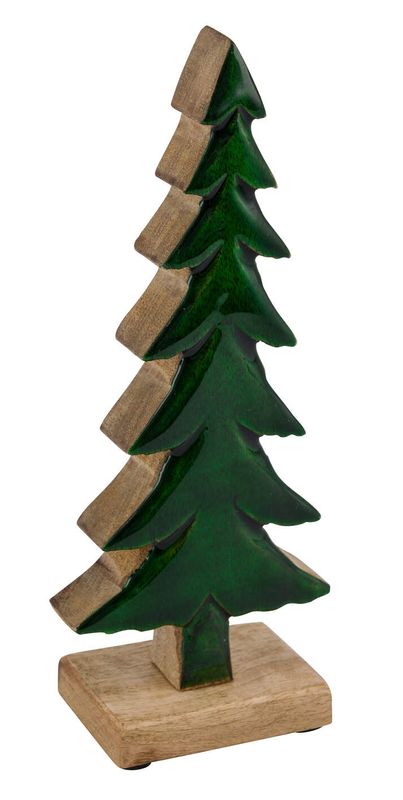 Ein Holzaufsteller Tannenbaum aus Mangoholz, eine Seite ist stilvoll in Dunkelgrün lackiert, die andere zeigt die natürliche Maserung des Holzes