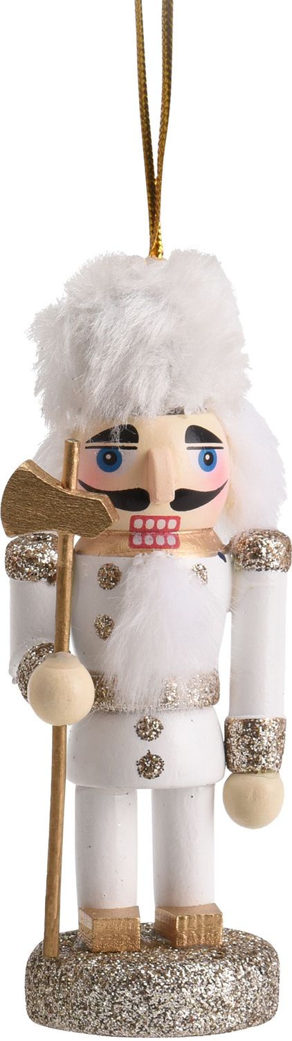 Diese vier eleganten Weihnachtsbaum-Anhänger in Form von Nussknackern in Weiß und Gold bringen festlichen Glanz in jede Weihnachtsdekoration