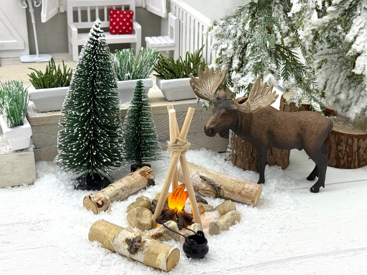 Wichtel Zubehör Lagerfeuer - Outdoor Winter Set – Mini LED-Feuerstelle, Kunsttanne, Birkenstämme, Kessel & Zubehör