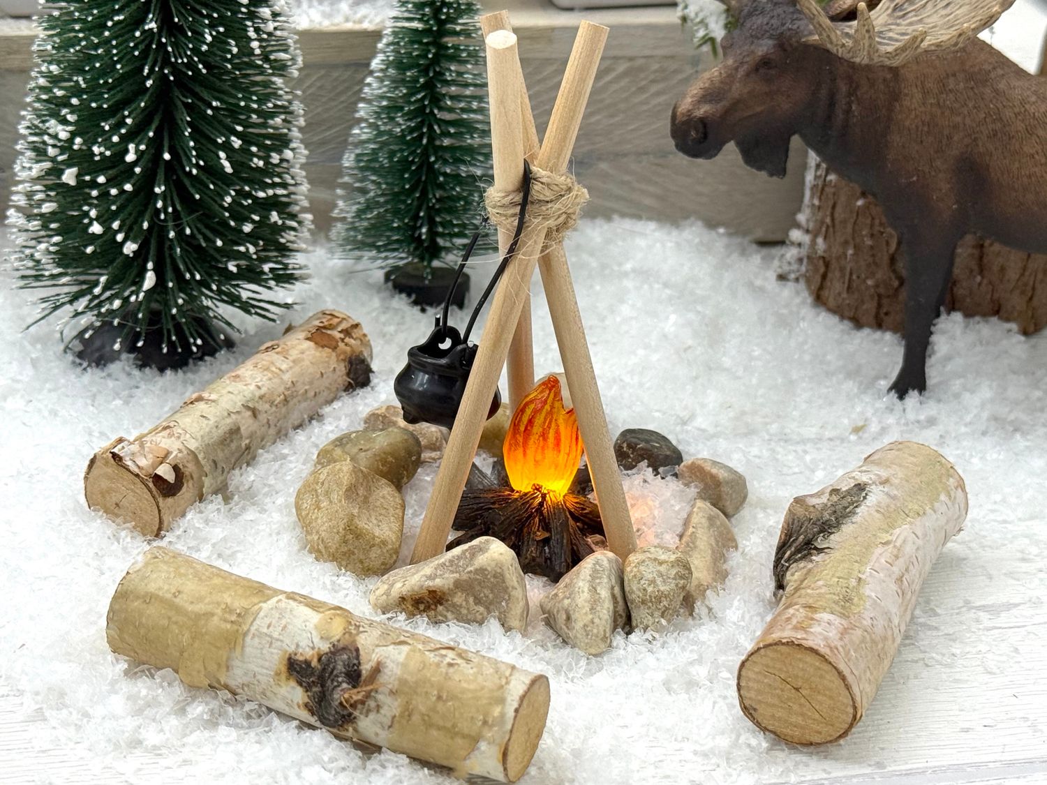 Mit diesem Lagerfeuer-Set zieht ein Hauch von Abenteuer in die Wichtelwelt: ein wärmendes Feuer, ein Kessel für heiße Wichtelsuppe und eine schneebedeckte Tanne – perfekt für die winterliche Magie der Weihnachtszeit