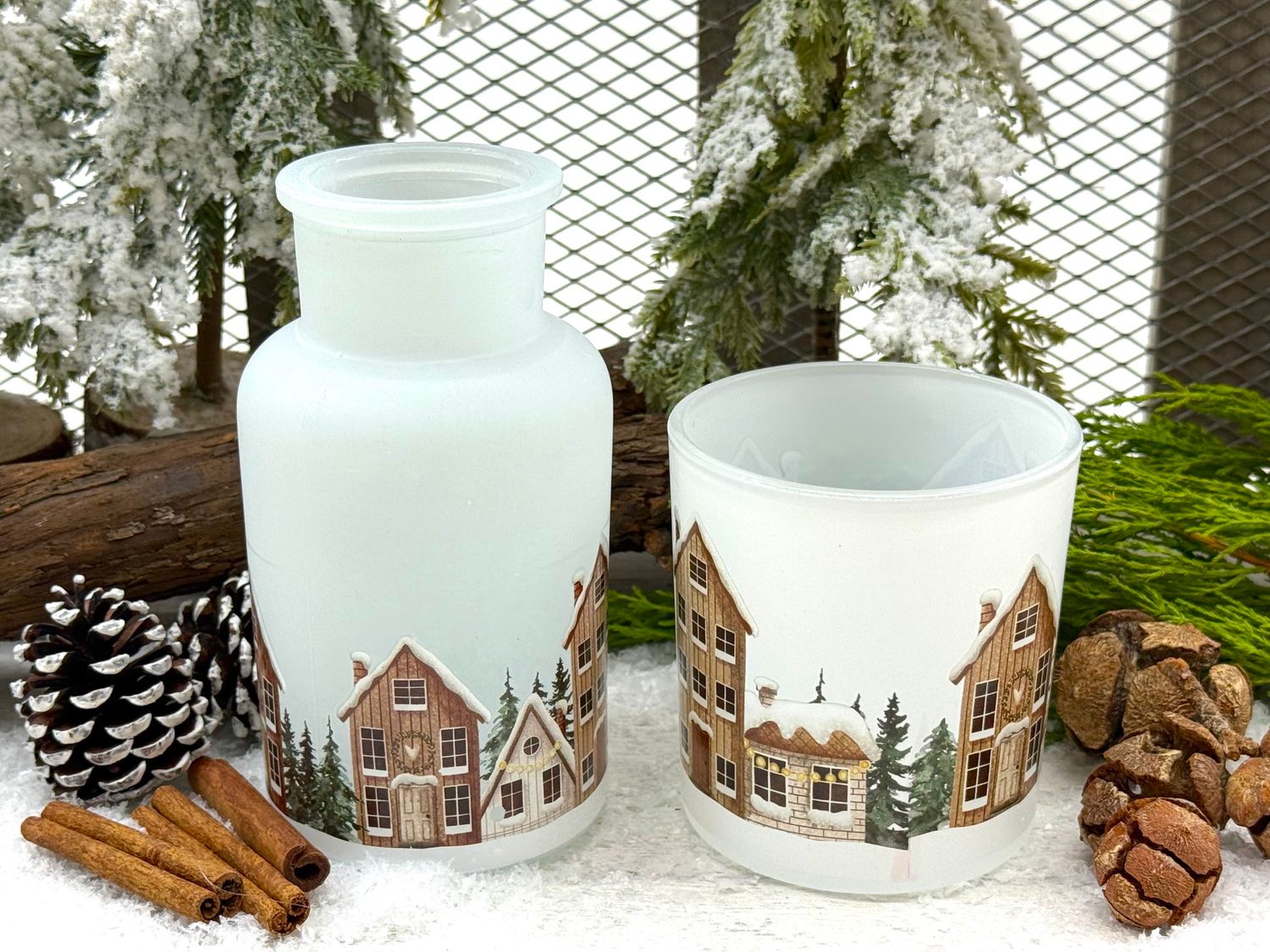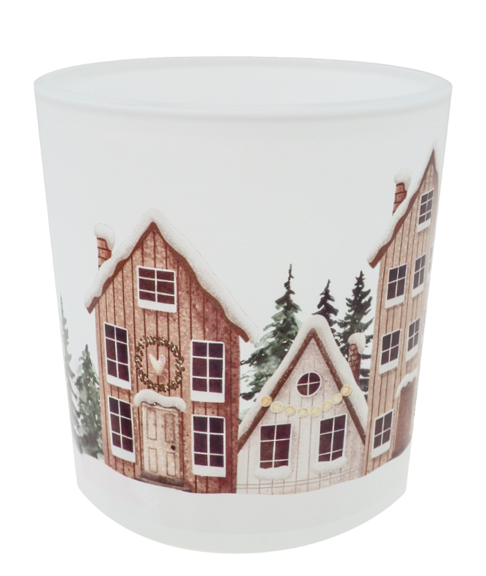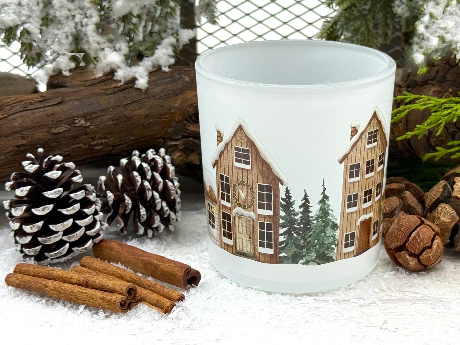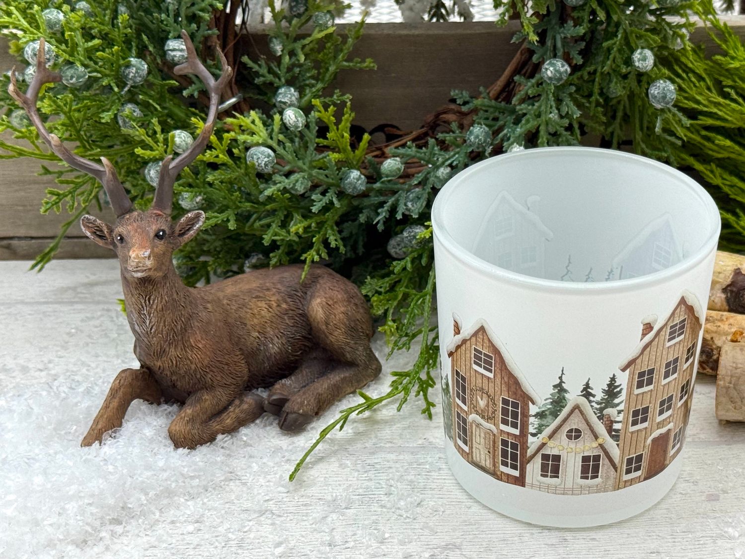 Windlicht aus Glas mit Winterlandschaft  Motiv – Milchglas-Optik, dekorierte Häuser & Tannenbäume