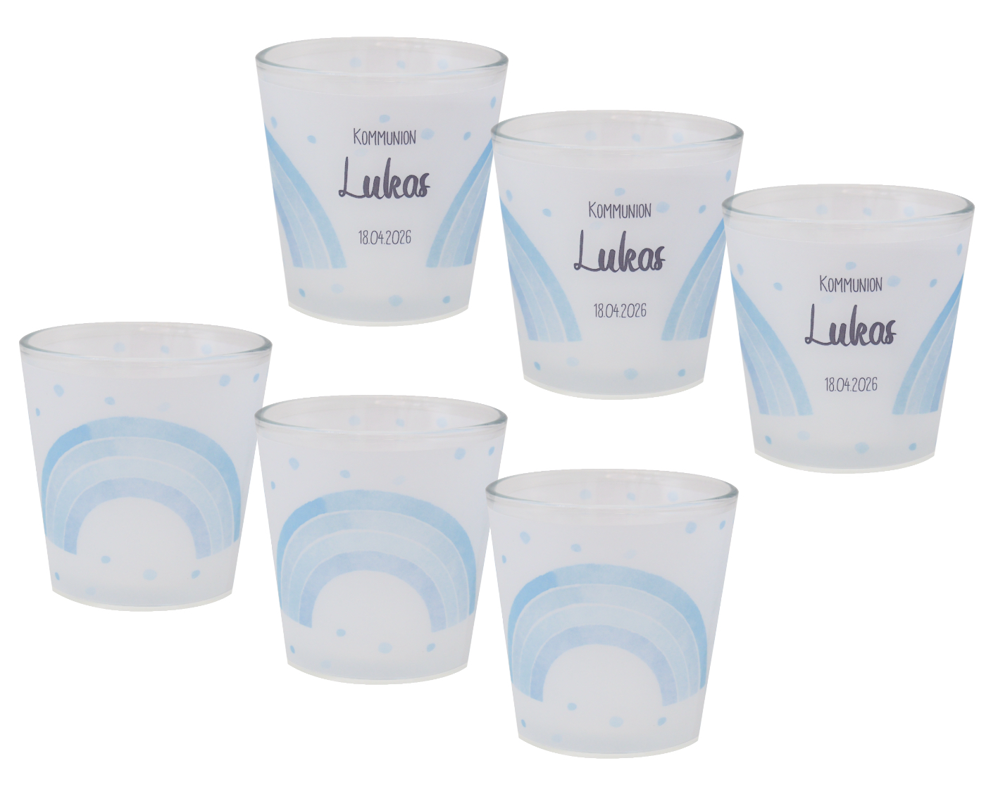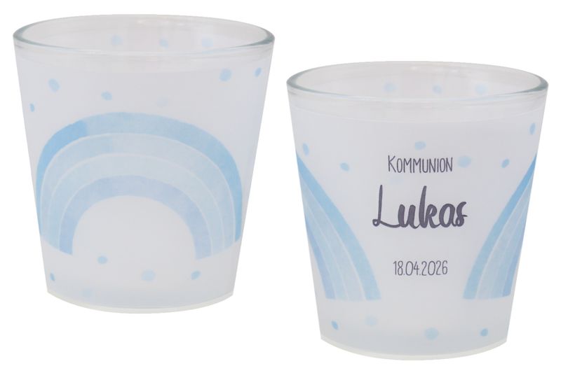 Personalisierbare Windlichter in Blau mit Regenbogen – liebevolle Deko für Kommunion, Konfirmation & Taufe