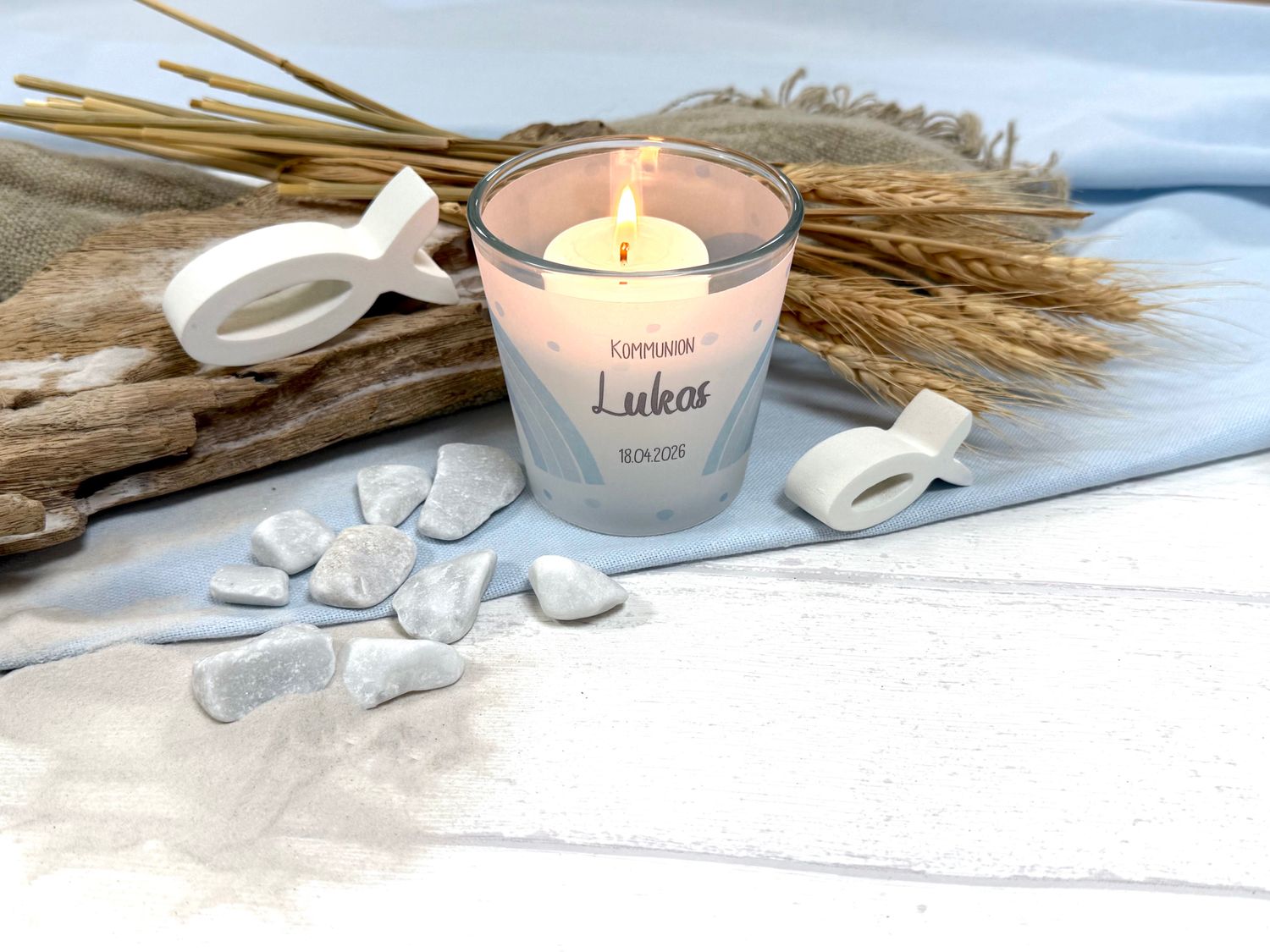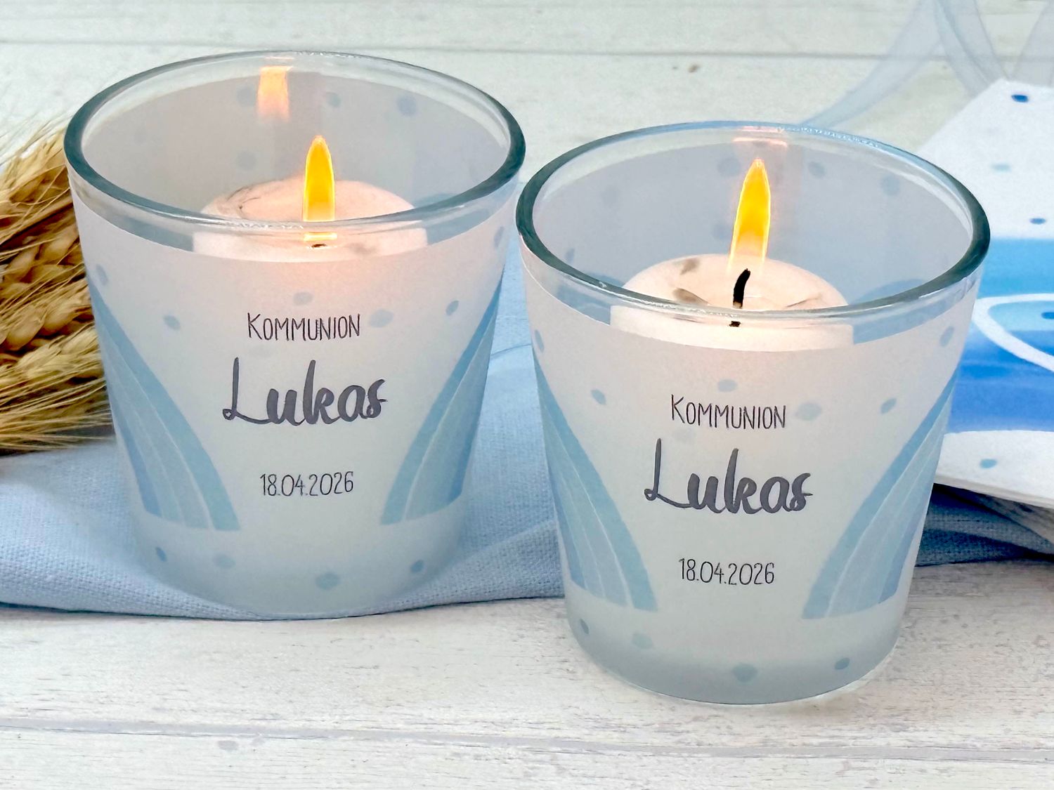 Diese wunderschönen Windlichter aus Glas sind eine liebevolle und symbolische Dekoration für besondere kirchliche Anlässe wie Taufe, Erstkommunion oder Konfirmation.