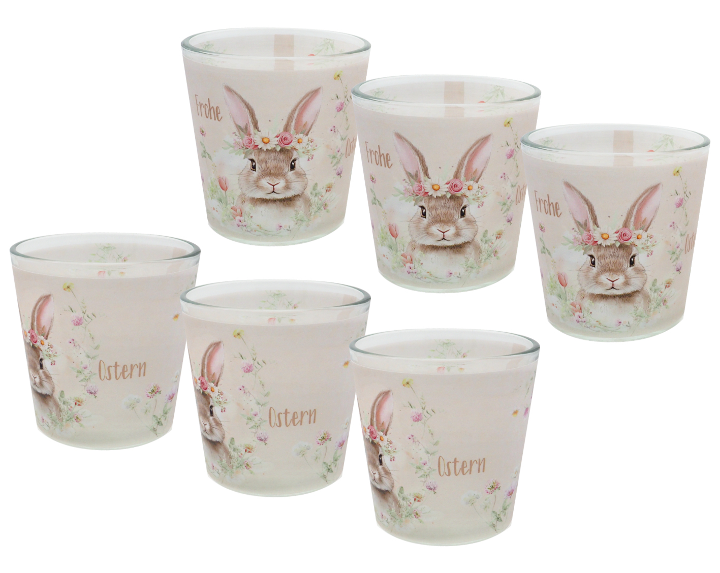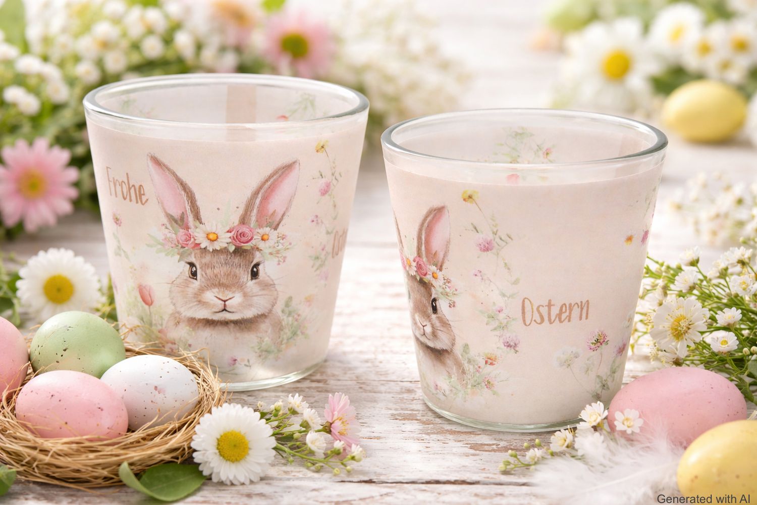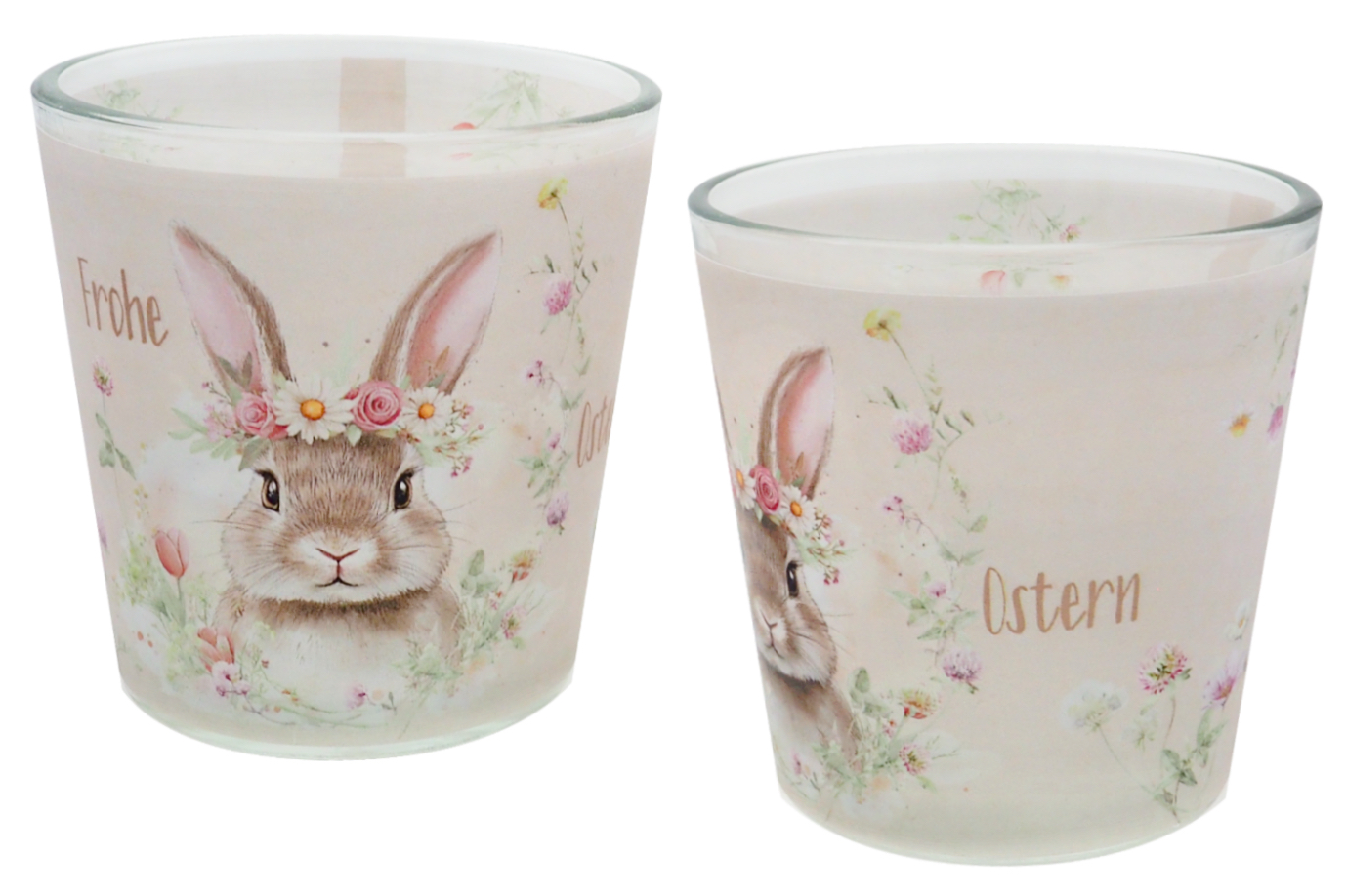 Windlicht aus Glas mit einer transparenten Banderole, die in Beige gehalten ist, mit einem Hasenkopf in der Mitte, der einen Blumenkranz trägt und dem Schriftzug "Frohe Ostern", dekoriert ist.Â