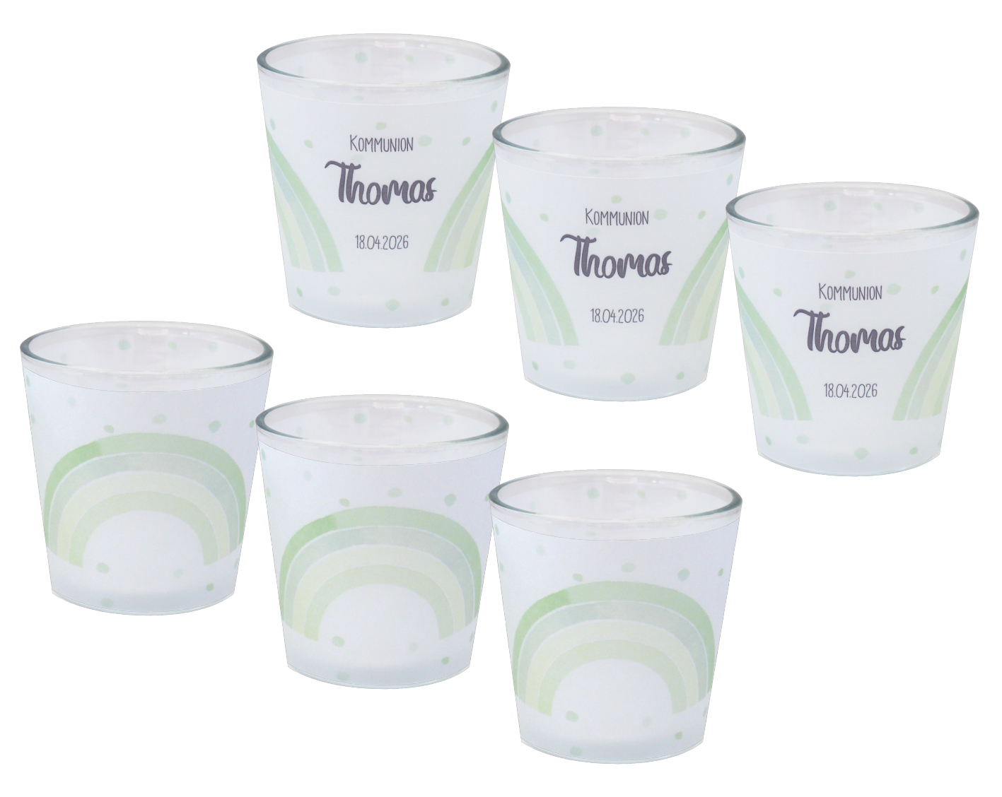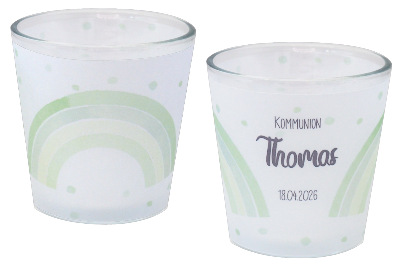 Windlichter aus Glas mit einer transparenten Banderole, die mit einem Regenbogen in Grün verziert sind und personalisiert werden können