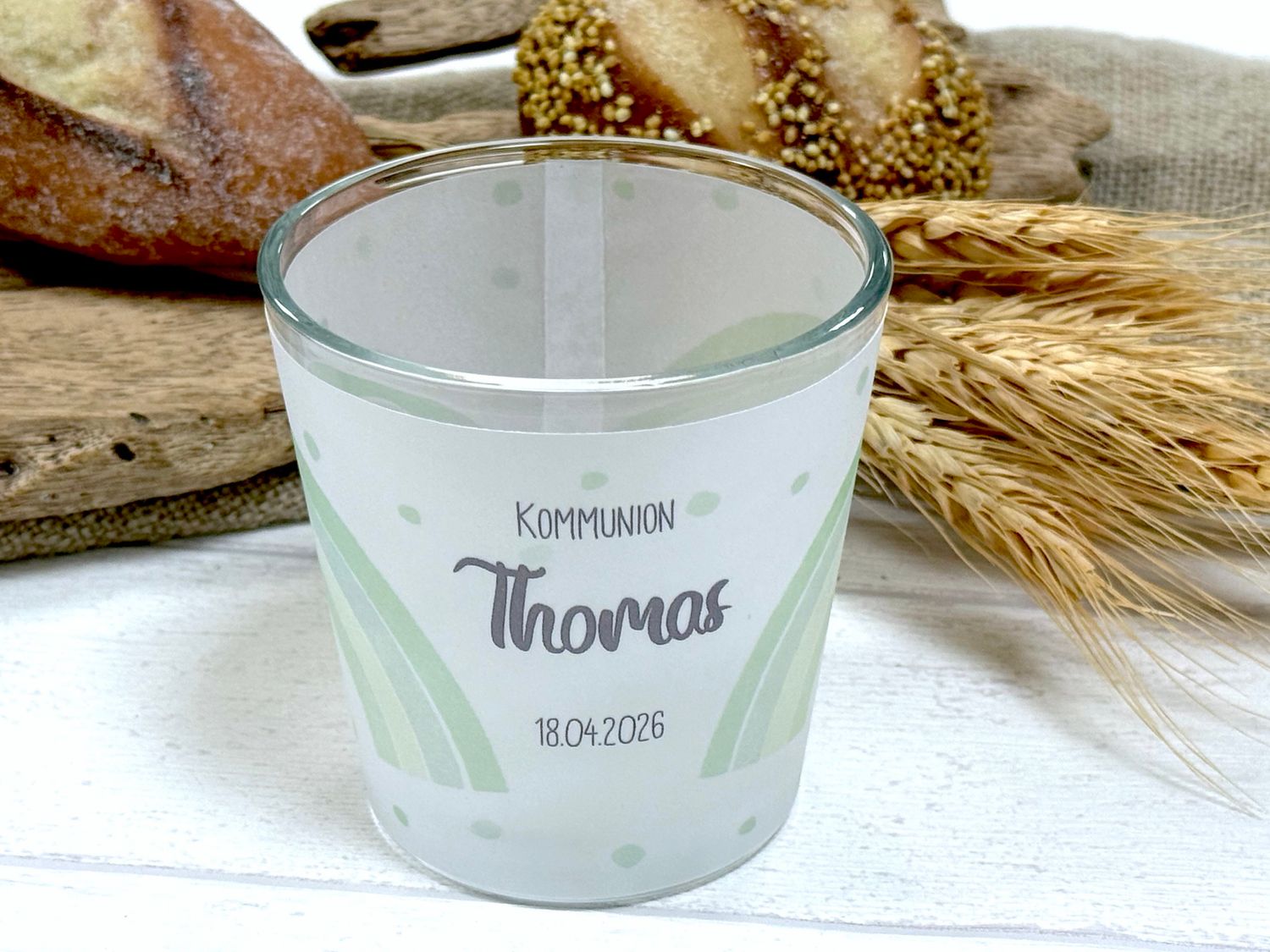 Diese wunderschönen Windlichter aus Glas sind eine liebevolle und symbolische Dekoration für besondere kirchliche Anlässe wie Taufe, Erstkommunion oder Konfirmation.