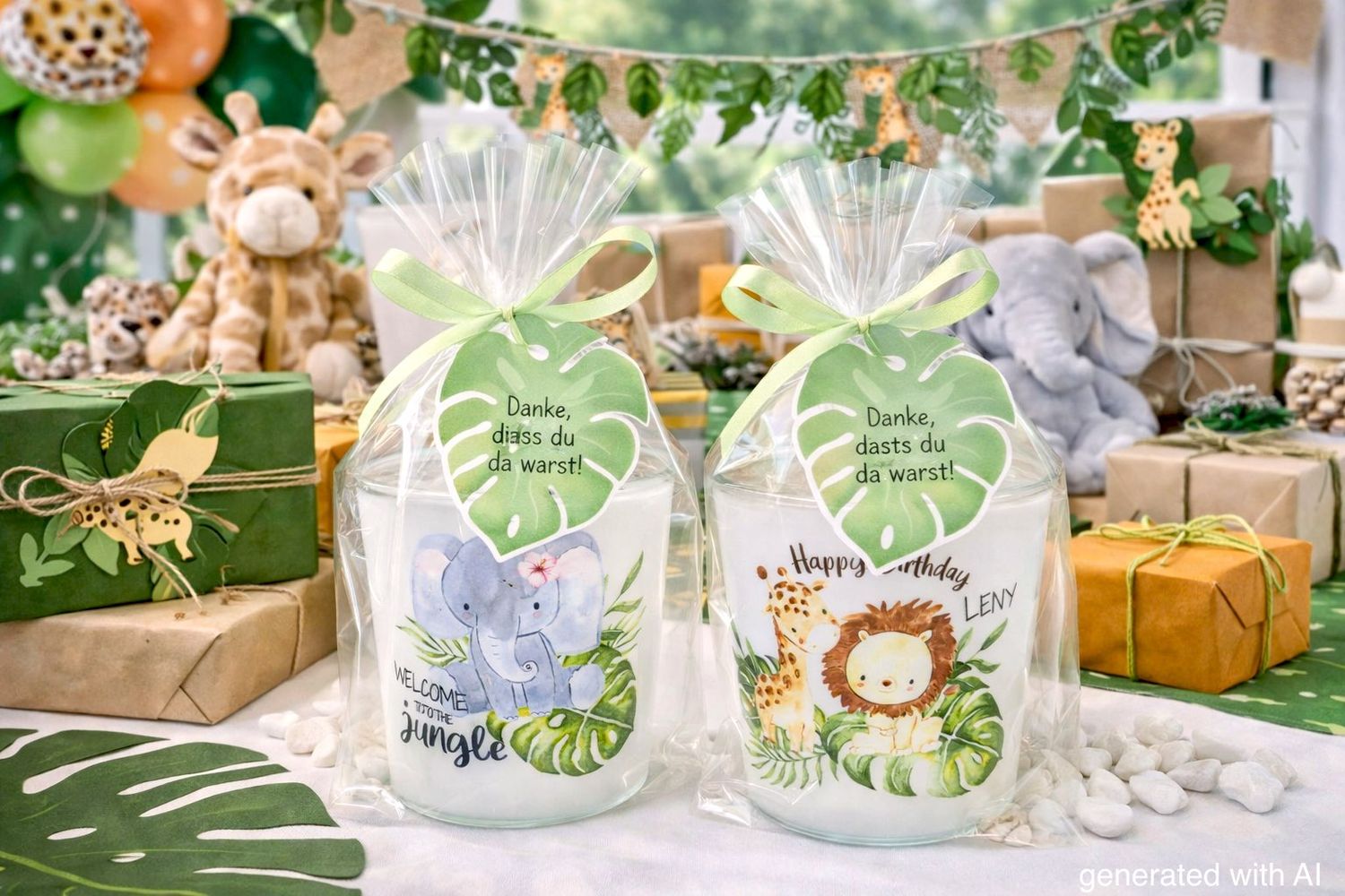Mit Elefant, Giraffe, Löwe und den Schriftzügen „Welcome to the Jungle“ sowie „Happy Birthday“ wird es zum Blickfang – und durch die Möglichkeit der Personalisierung mit einem Namen zu einem ganz individuellen Highlight.