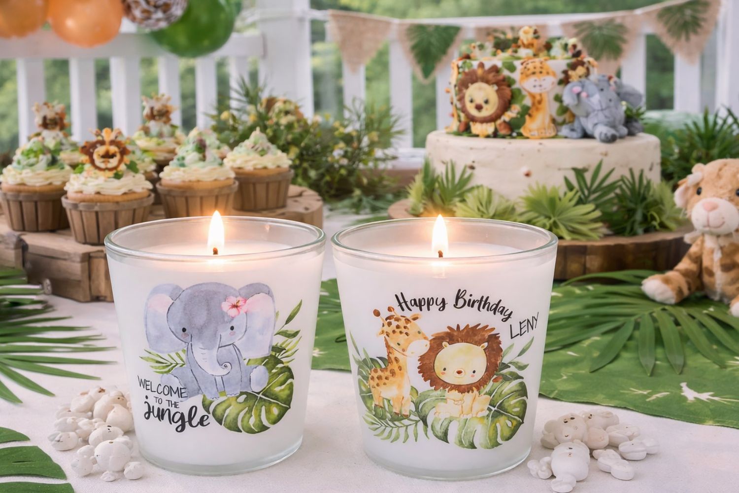 Windlicht aus Glas mit einer transparenten Banderole, die mit einem Jungle-Design verziert ist mit einem Elefanten, Giraffe und Löwe, sowie dem Schriftzug "Welcome to the Jungle" und "Happy Birthday" und kann mit einem Namen personalisiert werden kann