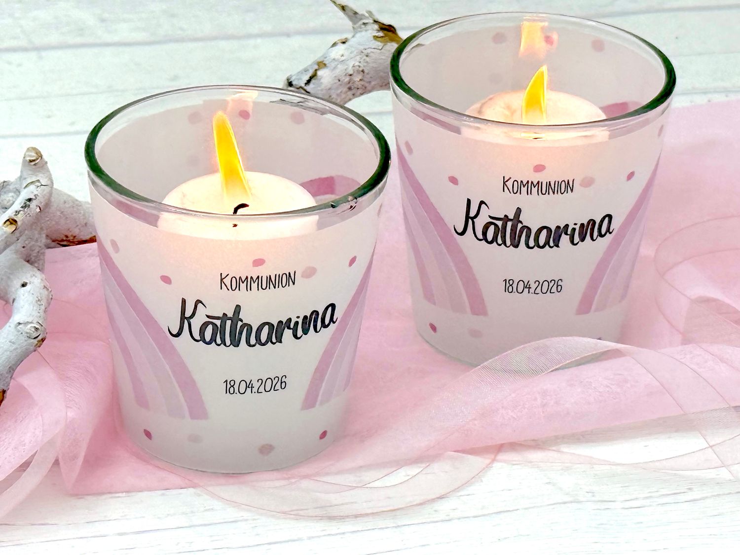 Personalisierbare Windlichter in Rosa mit Regenbogen – liebevolle Deko für Kommunion, Konfirmation & Taufe