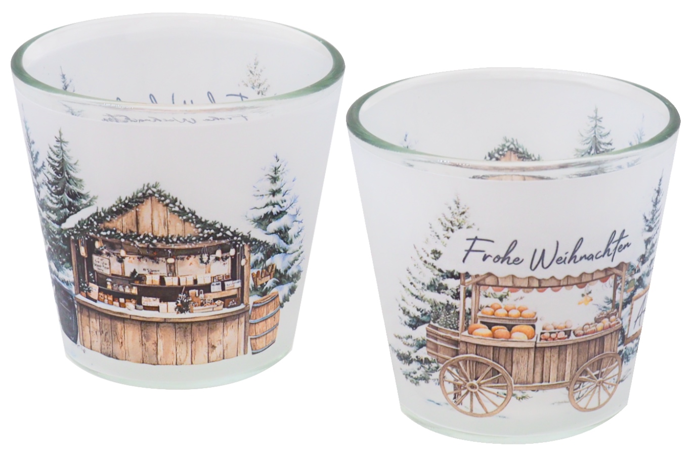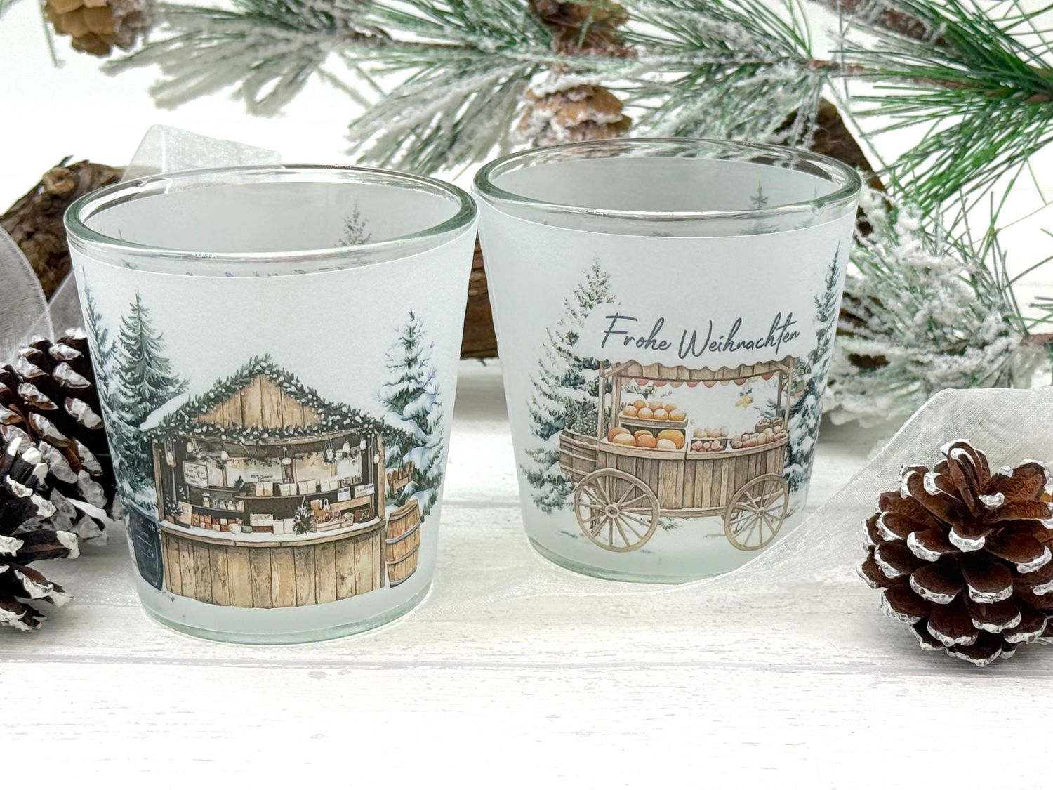 Windlicht aus Glas mit einer transparenten Banderole, die mit einem Weihnachtsmarkt-Design verziert ist mit zwei Weihnachtsmarkt Design, sowie dem Schriftzug "Frohe Weihnachten" und ein Schild der mit einem Namen personalisiert werden kann.