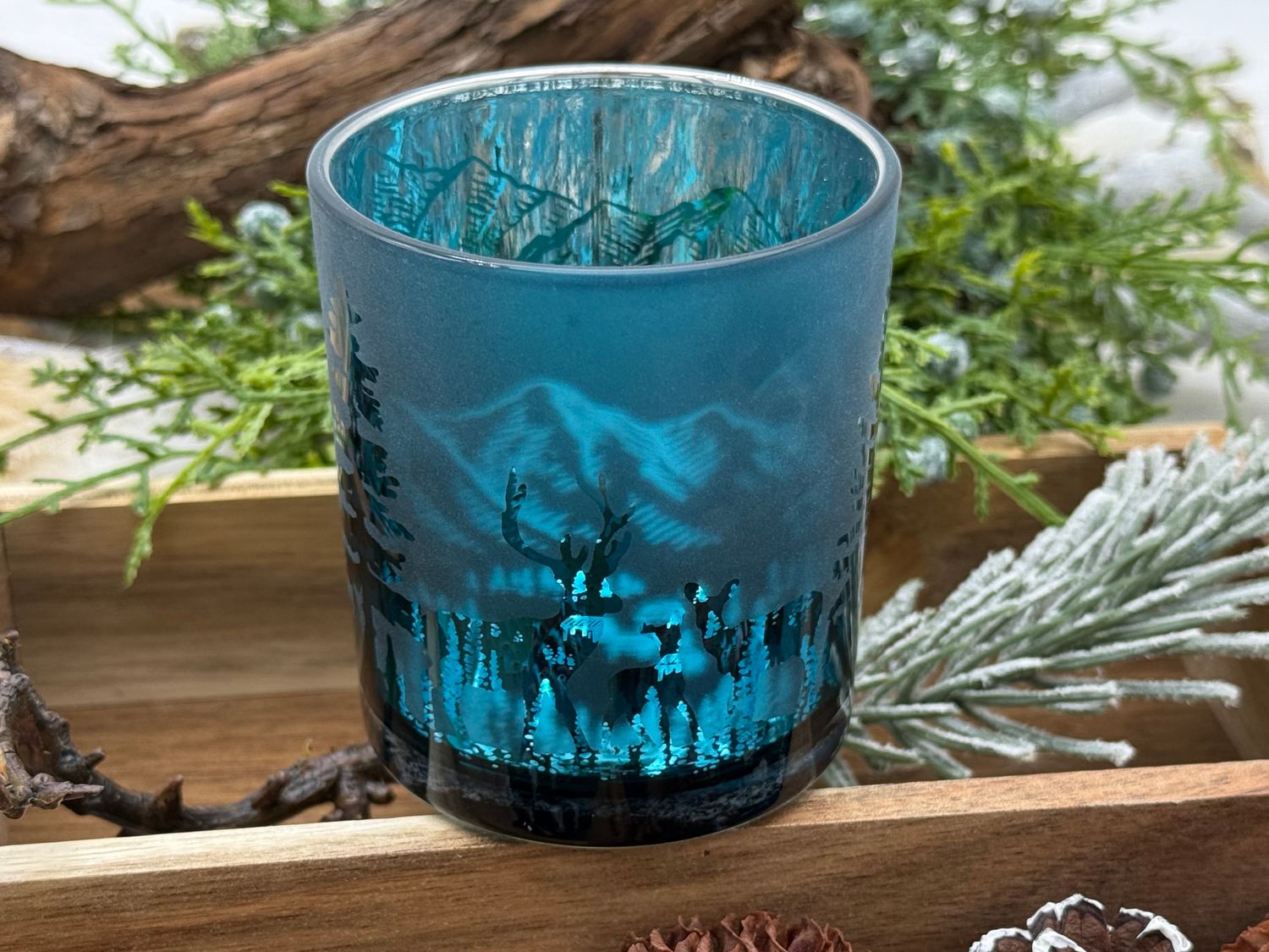 Windlicht aus Glas in Petrol Blau mit Wald- und Hirschmotiv