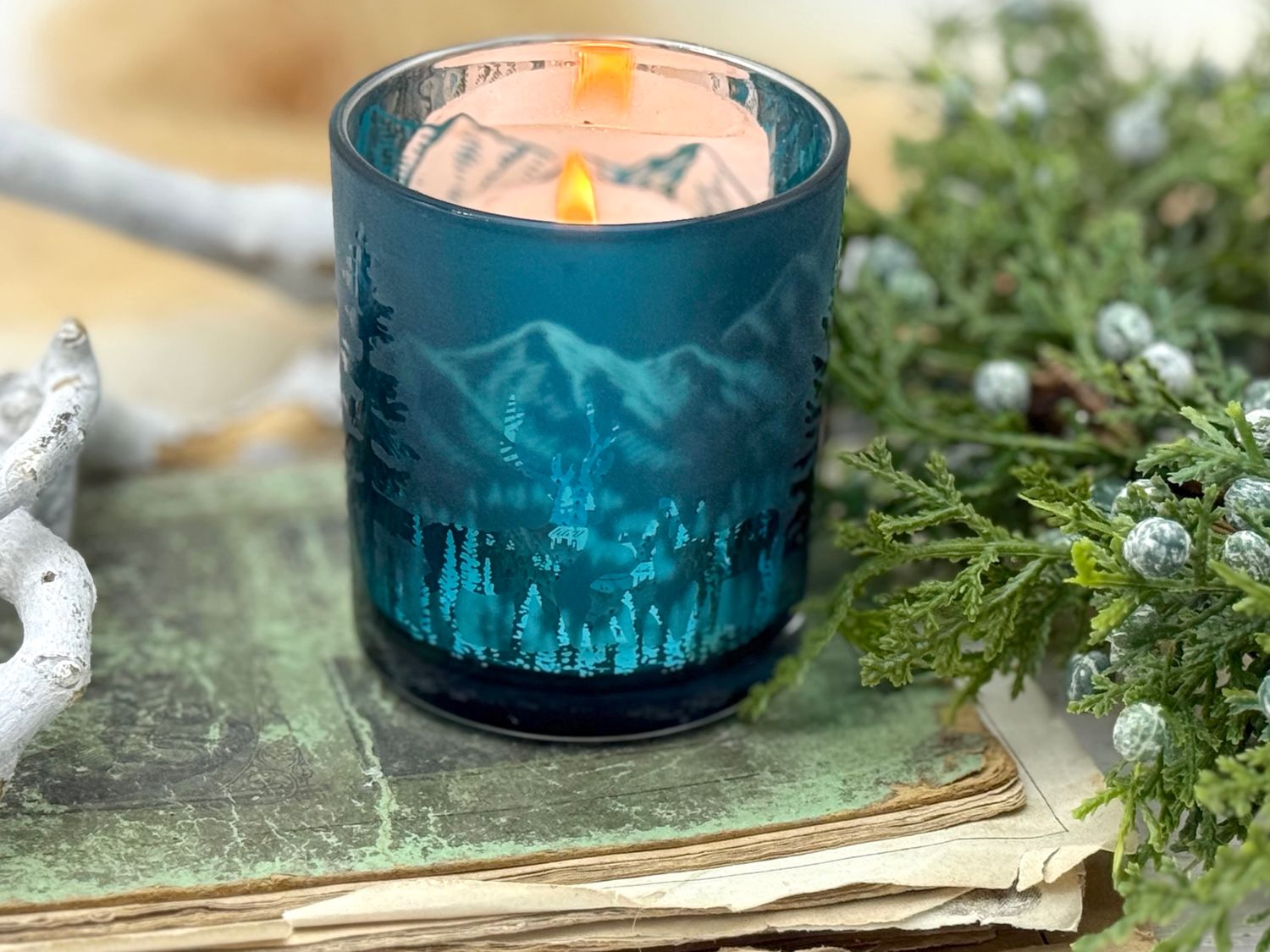 Ein hochwertiges Glas-Windlicht mit detailreichem Motiv: Wald, Berge & Hirsche. Außen in edlem Petrol, innen silberfarben – für wunderschöne Lichteffekte