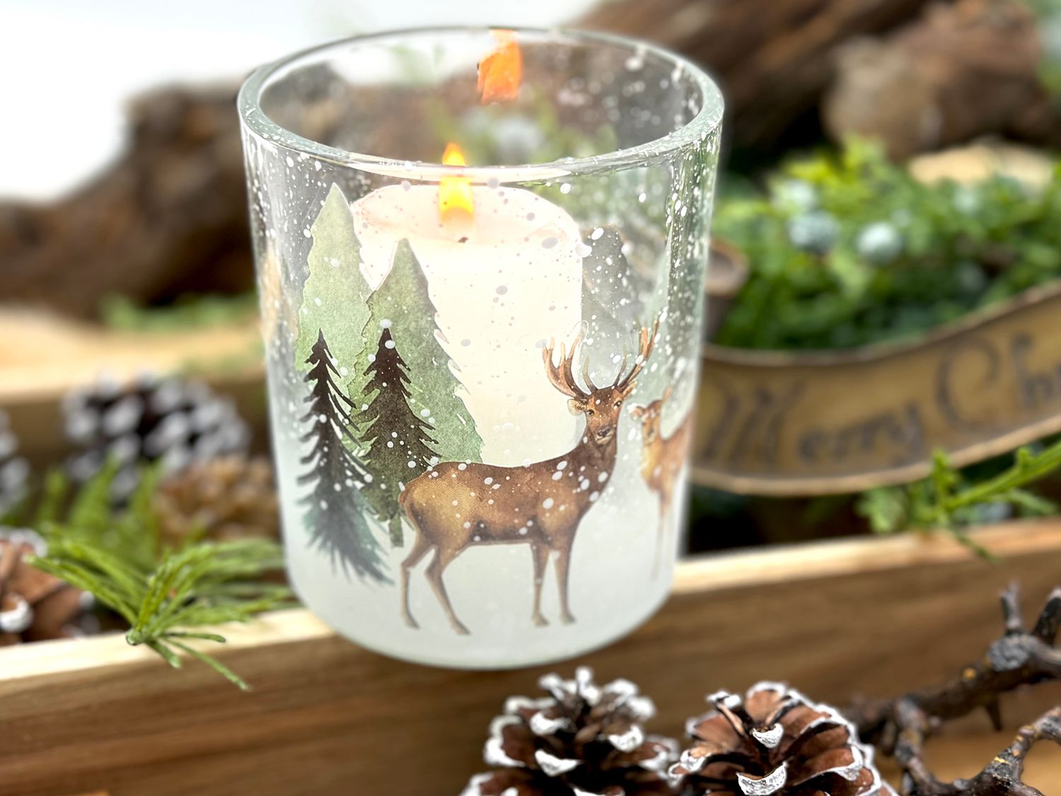 Weihnachtliches Windlicht Glas mit Hirschpaar im Schnee.