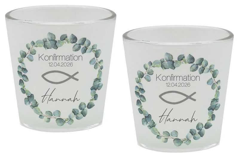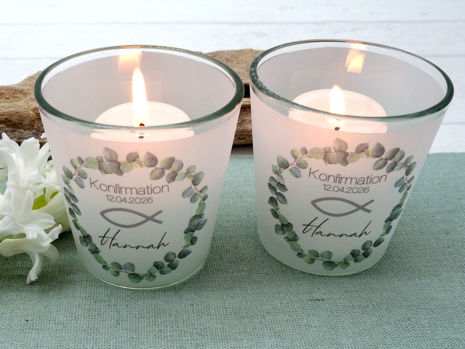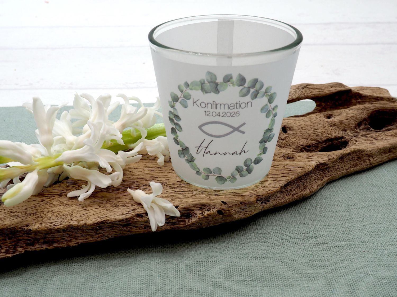 Windlichter aus Glas mit einer transparenten Banderole, die mit einem Fisch und Eukalyptus-Motiv verziert – individuell gestaltbar mit Name, Datum oder Anlass