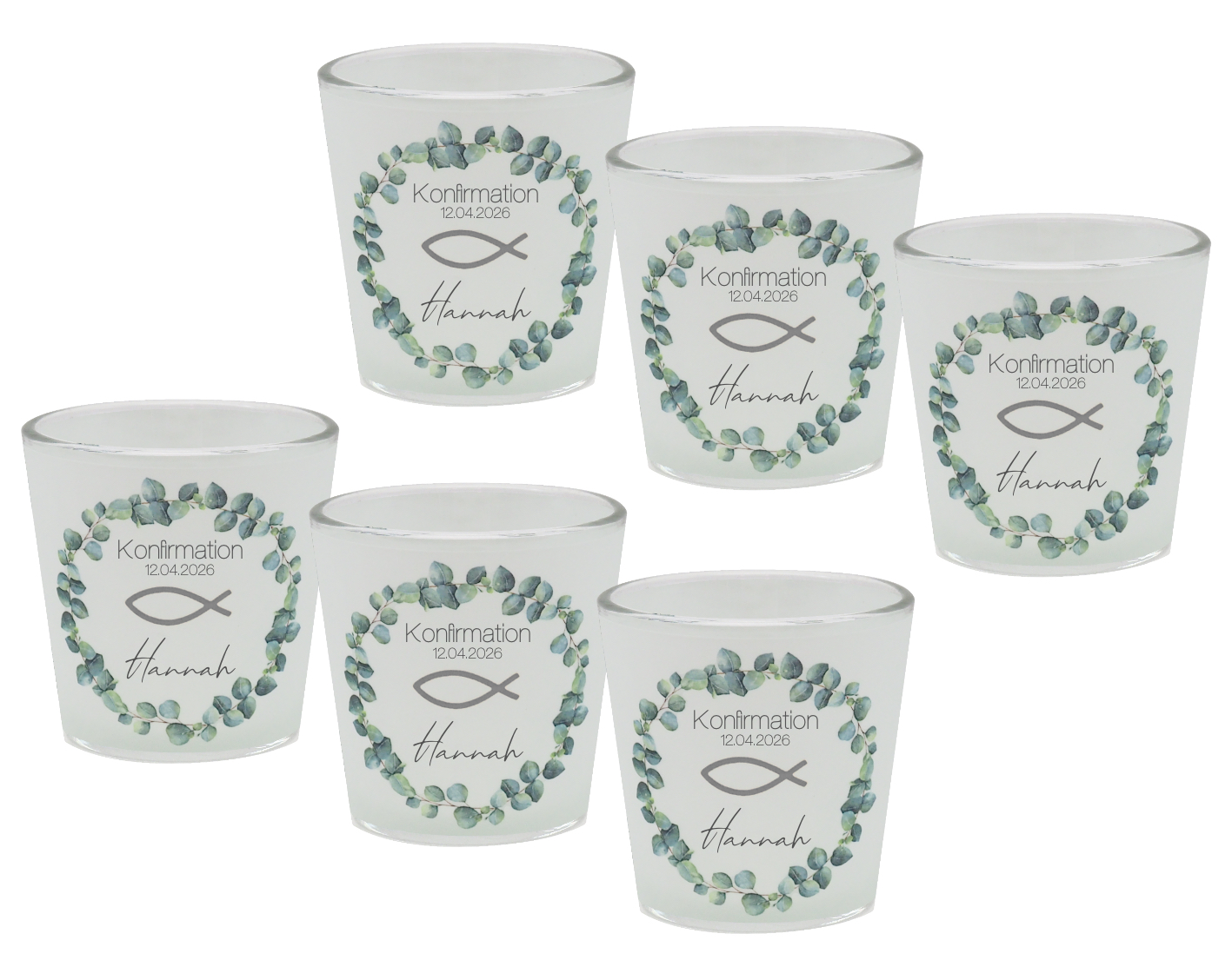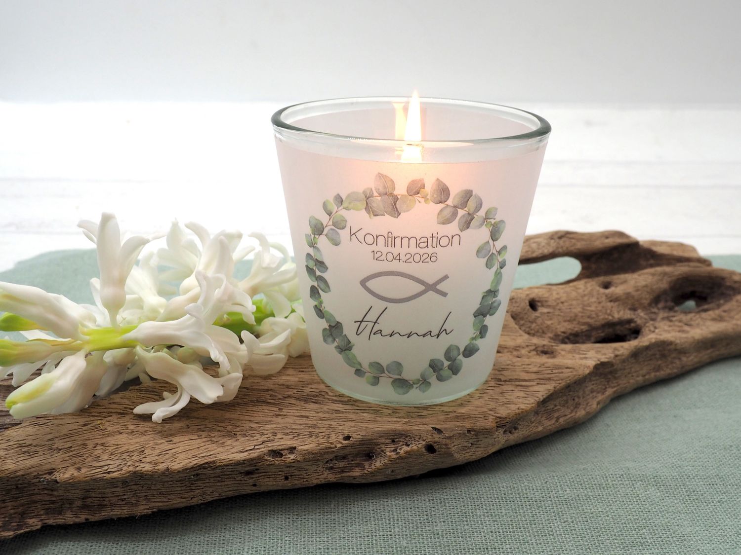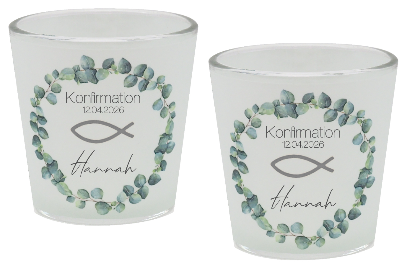 Windlichter aus Glas mit einer transparenten Banderole, die mit einem Fisch und Eukalyptus-Motiv verziert – individuell gestaltbar mit Name, Datum oder Anlass